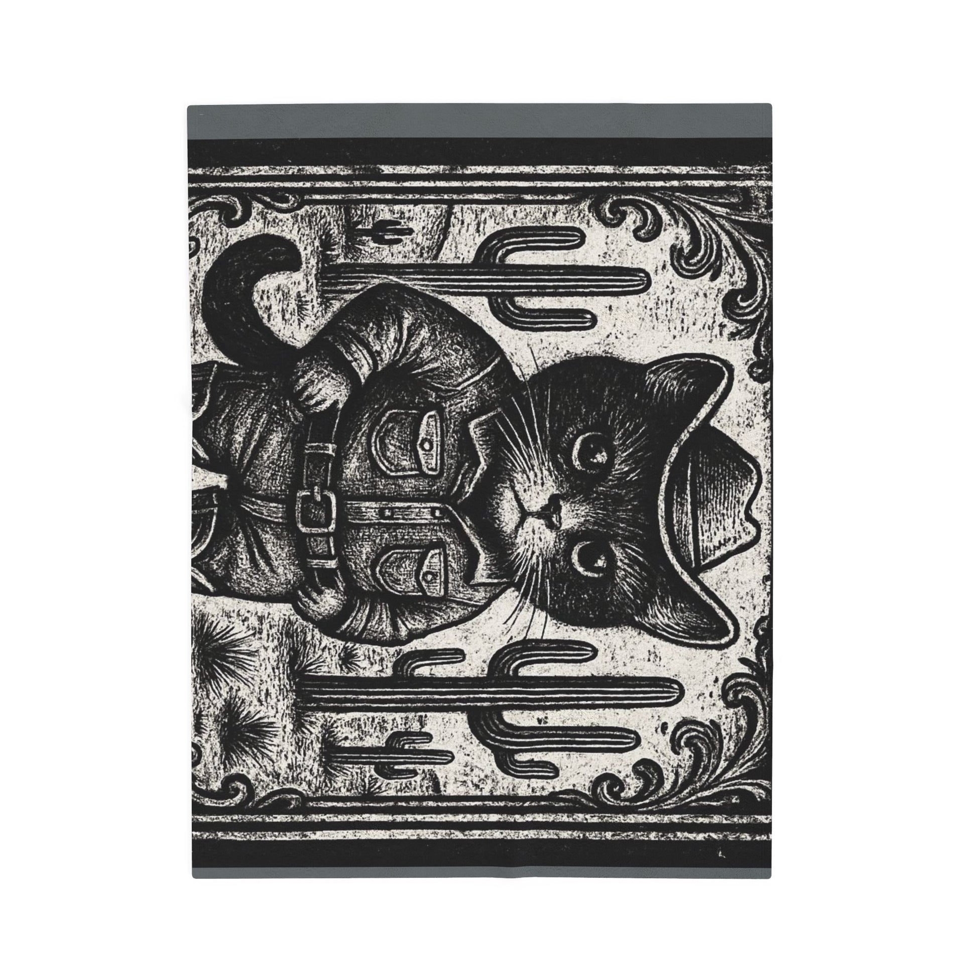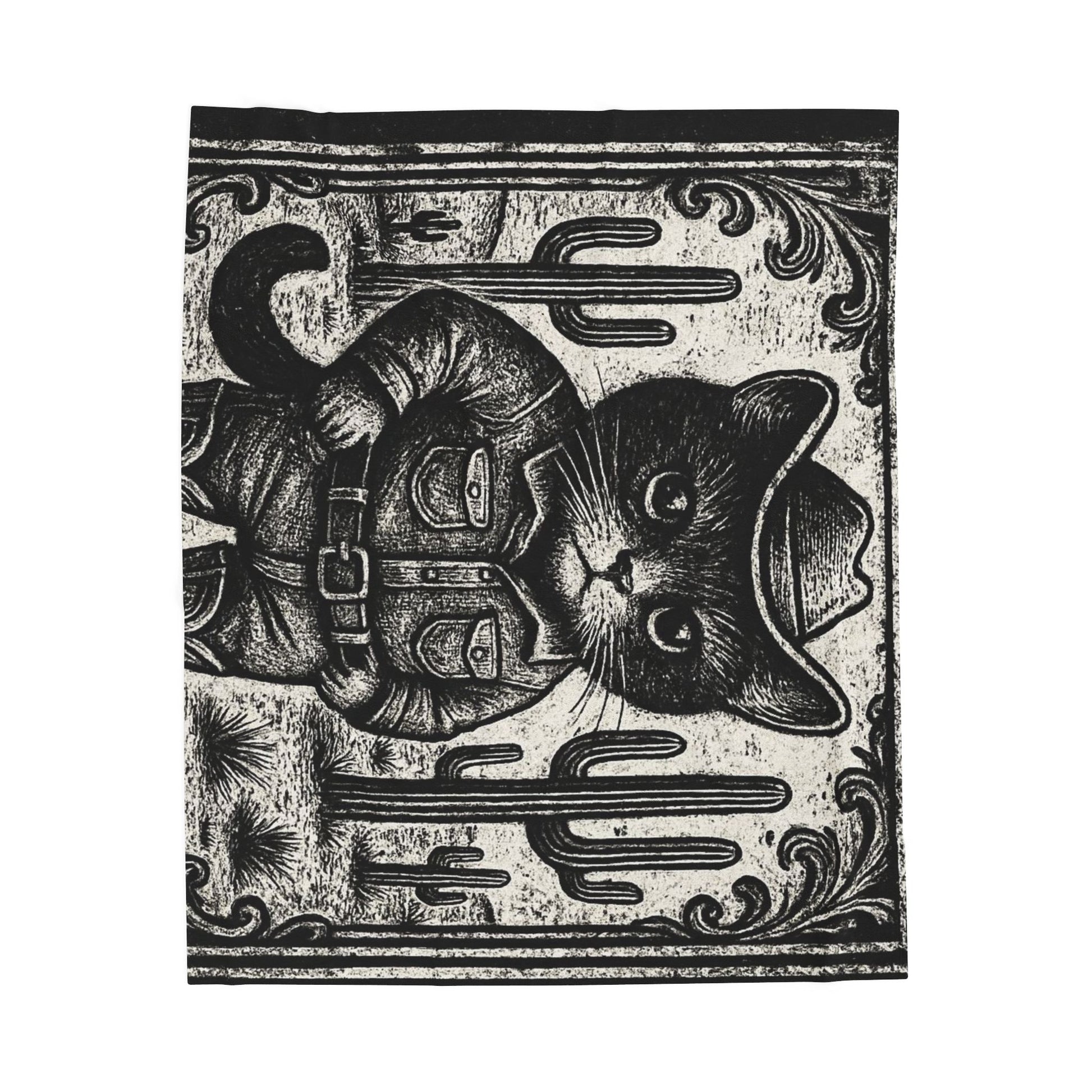 Black Cat Cowboy illustration Velveteen Plush Blanket | Western kitten art, vintage woodcut style