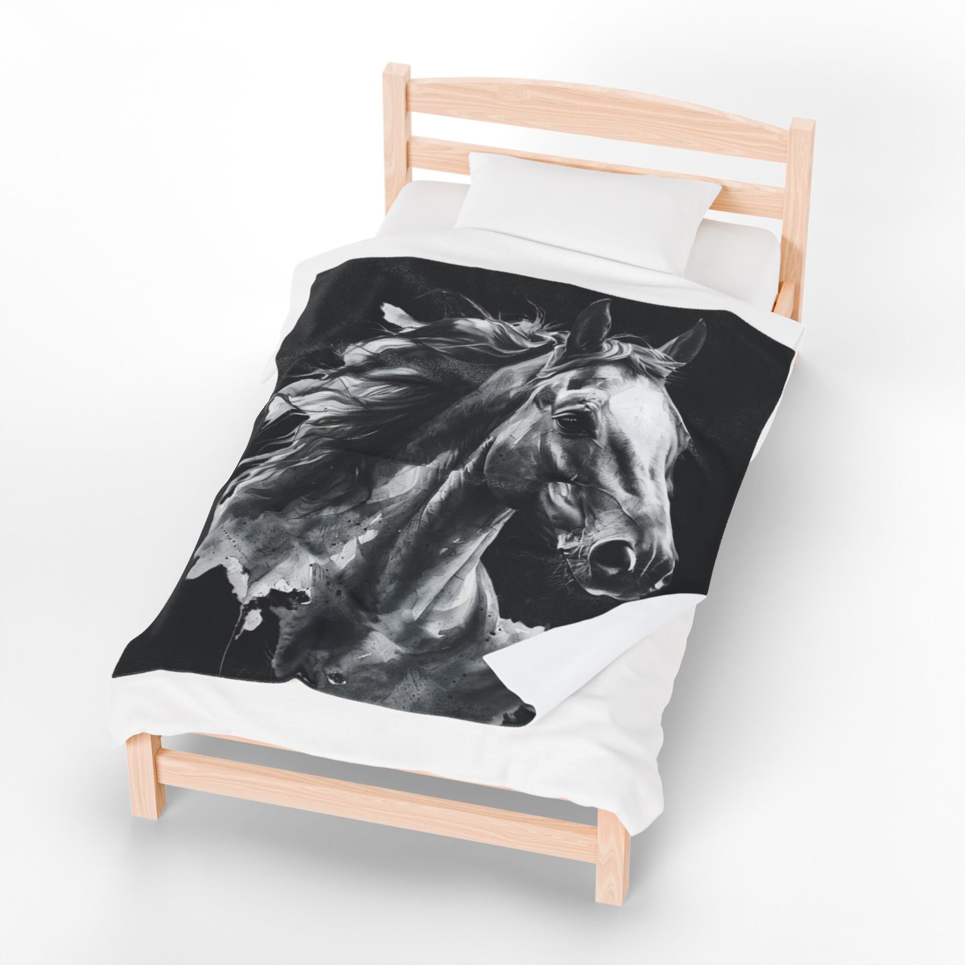 Black stallion art blanket designed for horse lovers who appreciate bold elegance. This plush velveteen throw features a striking black-and-white horse illustration, creating a dramatic and artistic focal point for your bedroom or living space. Perfect for equestrians, Western décor fans, and anyone who loves high-contrast animal art, this cozy blanket adds warmth, texture, and personality to any room. Its soft-touch fabric makes it ideal for snuggling, gifting, or displaying as a decorative statement piece. Whether used as a bed throw, sofa blanket, or unique equine gift, this stunning horse design delivers comfort and style effortlessly. Create a cozy and warm atmosphere at home with this plush velveteen blanket. It is soft to touch and perfect for any home. Customize with a one-sided print to add your personal touch or create a gift for your friends and family. Available in three sizes: 30x40", 50x60", 60x80". Please note: Due to variations in the production process, blankets may arrive up to 3" shorter than their listed size. .: 100% polyester (SPOKE and Printify Choice) or 83% Polyester and 17% Spandex (Miami Sublimation) .: Your print goes on one side of the blanket in high detail and vibrant color .: Medium heavy-weight fabric (8.85 oz/yd² (300 g/m²)) that feels extra soft to the touch (thickness of the fabric may slightly vary)