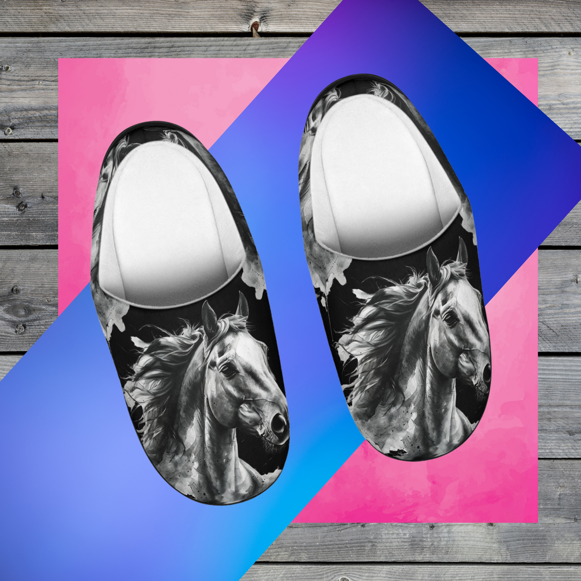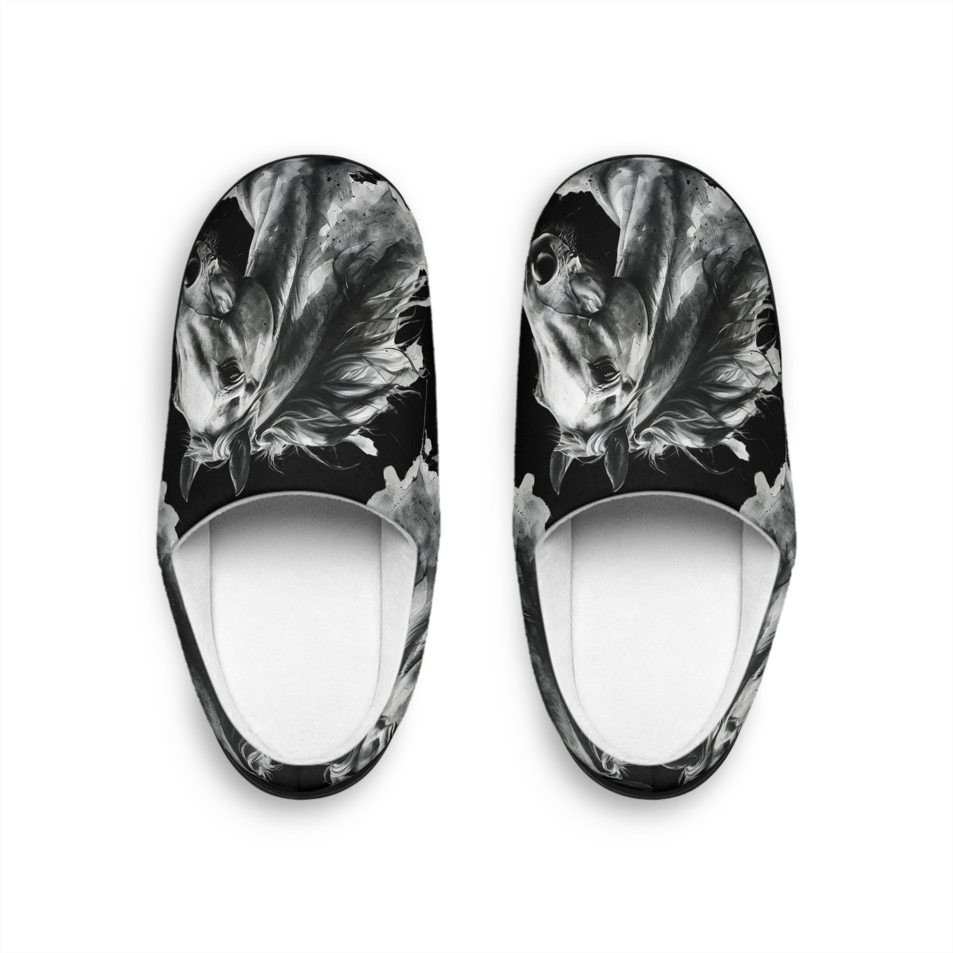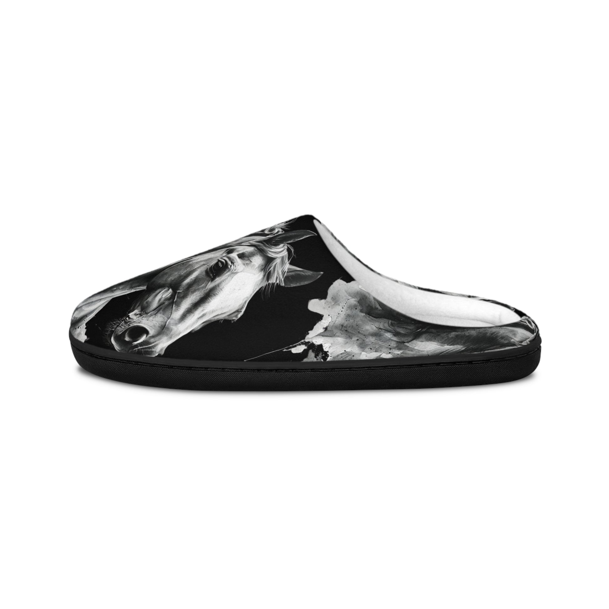 Black stallion art slippers designed for horse lovers who crave style. These cozy indoor slippers feature a dramatic black-and-white horse illustration, perfect for equestrians, Western décor fans, and anyone who loves bold animal artistry. Made for comfort and warmth, the soft cushioned interior keeps your feet cozy while the eye-catching stallion design adds an elegant, high-contrast touch to your loungewear. Ideal as a unique horse lover gift, relaxing home footwear, or stylish everyday comfort, these slippers blend durability, artistry, and personality in every step. These personalized slippers are a home staple that now becomes even more stylish thanks to your custom touch. Each slipper is made 100% with soft, comfy flannel fleece fabric while the outer sole is flexible, anti-skid, and delivers higher durability along with a better grip on shiny floors. .: Material: 100% polyester outer-layer and lining .: Black rubber sole .: Removable insole