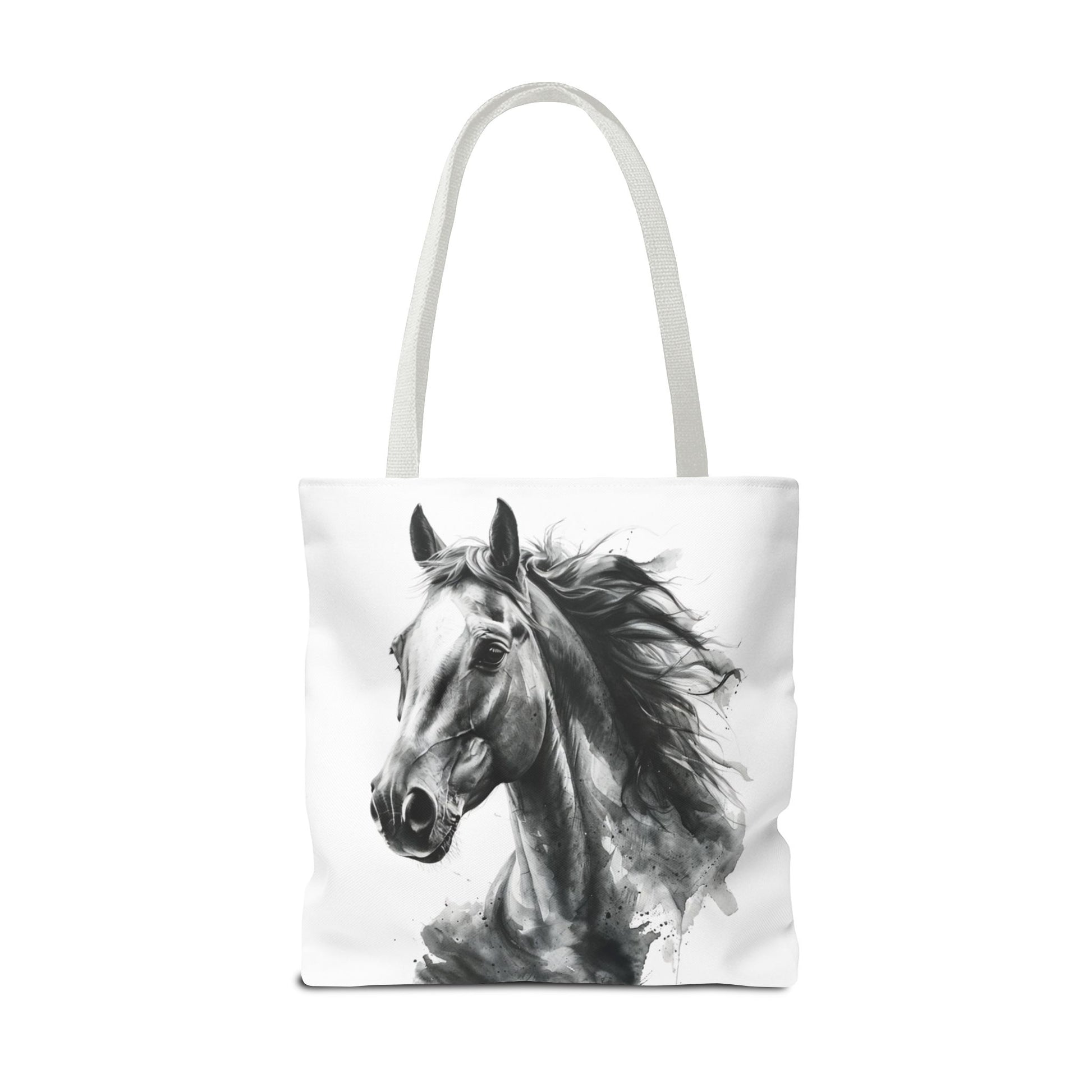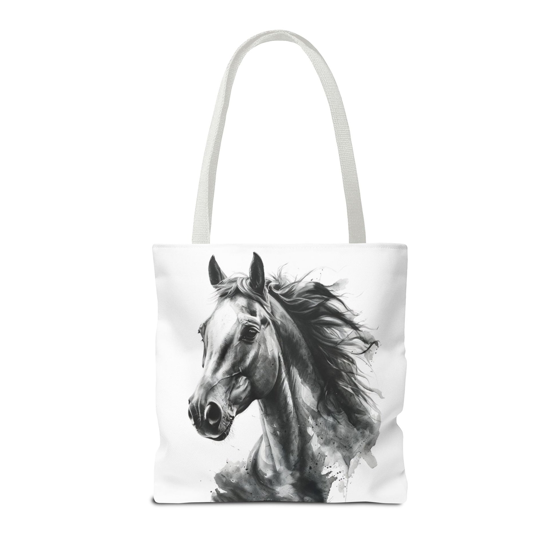 This stunning equine-inspired carryall features a dramatic black-and-white horse illustration that blends fine art with functional design. Perfect for everyday use, this durable tote offers plenty of space for books, groceries, gym essentials, or travel items. The bold stallion artwork makes it an ideal gift for equestrians, Western décor fans, and anyone who appreciates expressive animal art. Lightweight yet strong, this horse lover tote bag delivers beauty, personality, and practicality in one versatile accessory.