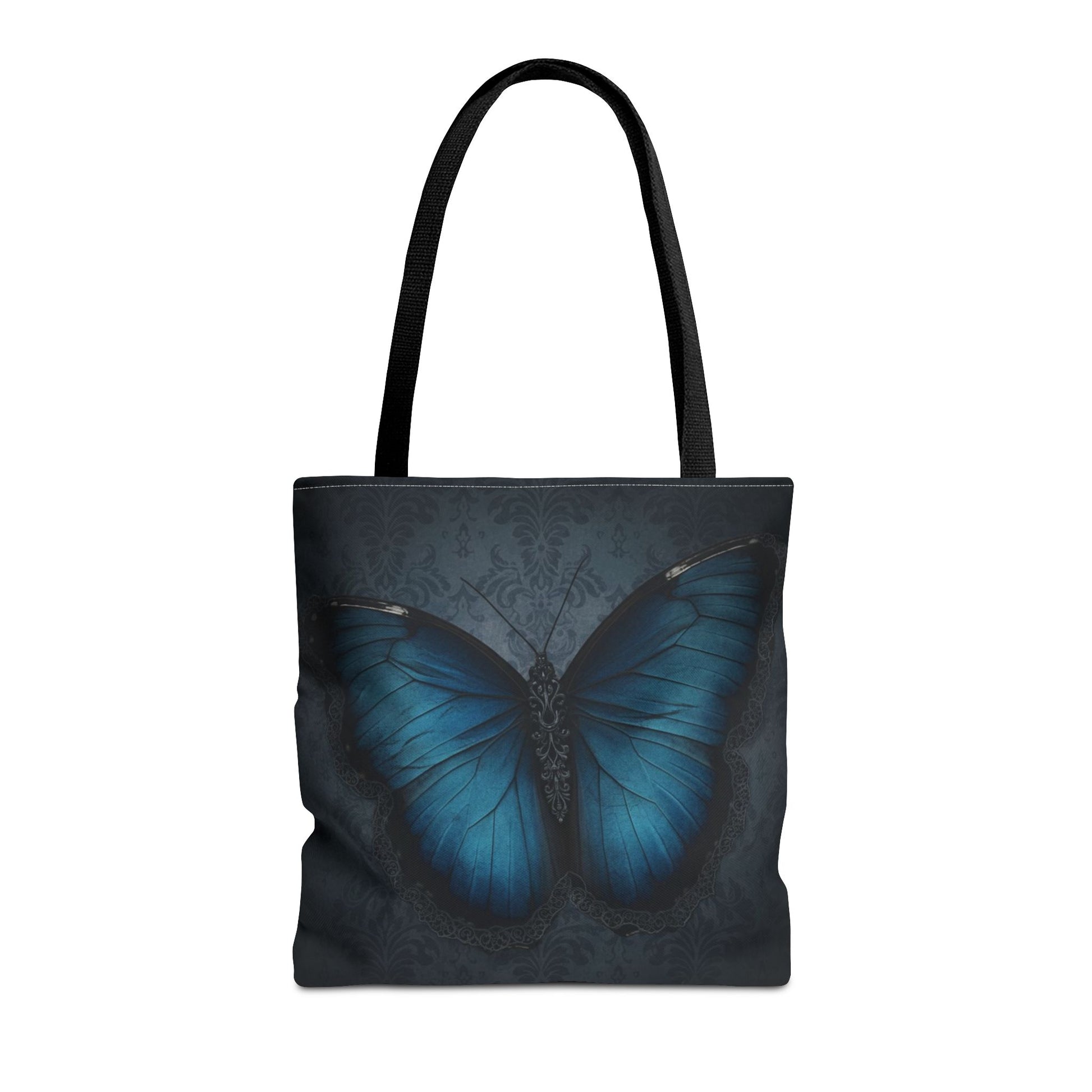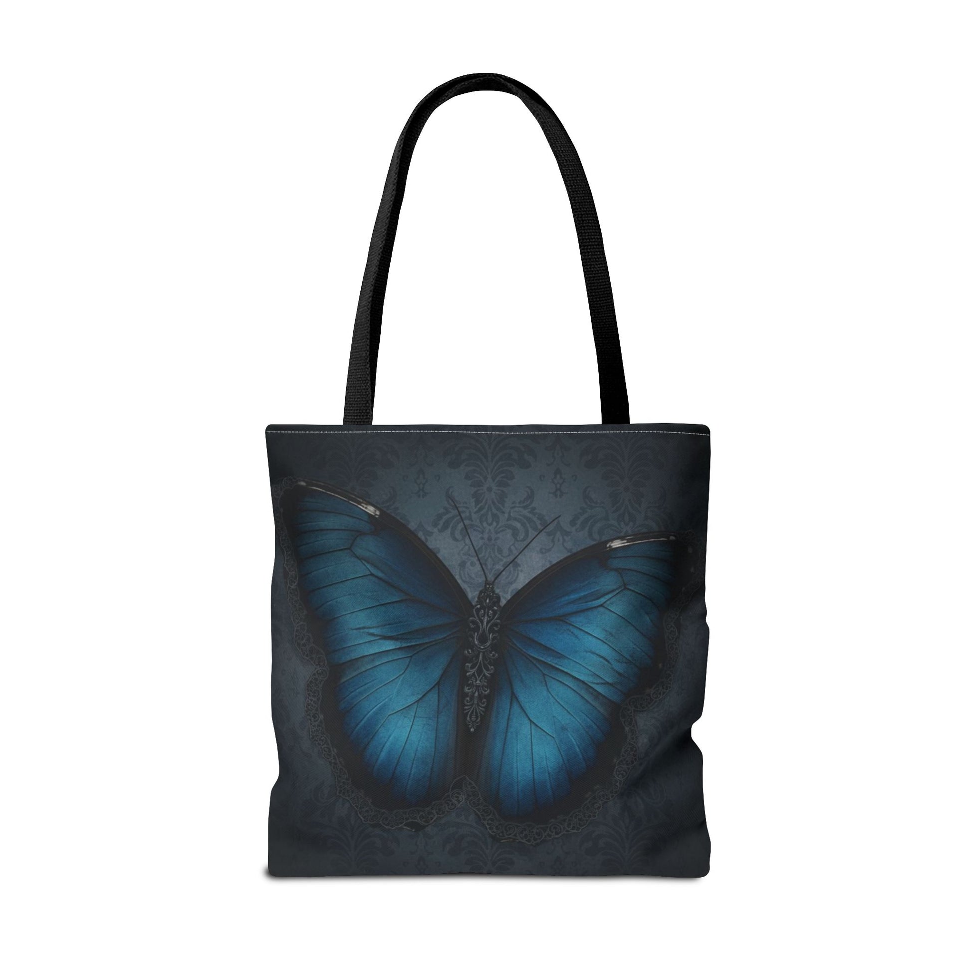 This stunning dark-themed tote features a detailed blue butterfly centered on a textured damask background, creating a moody, artistic, and sophisticated look. Perfect as an everyday carry bag, book bag, or gift for butterfly lovers, gothic fashion fans, and anyone who loves unique aesthetic accessories. Durable, reusable, and designed to add a touch of elegance to every outfit.