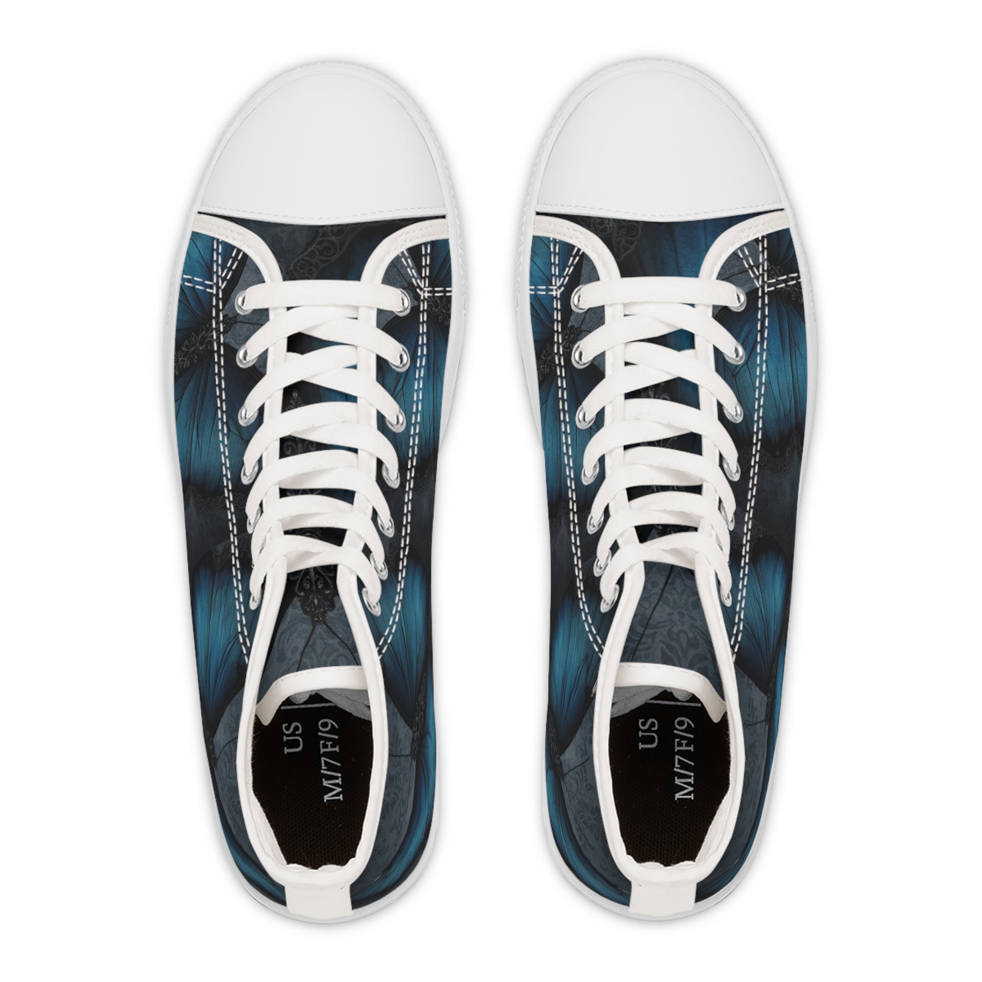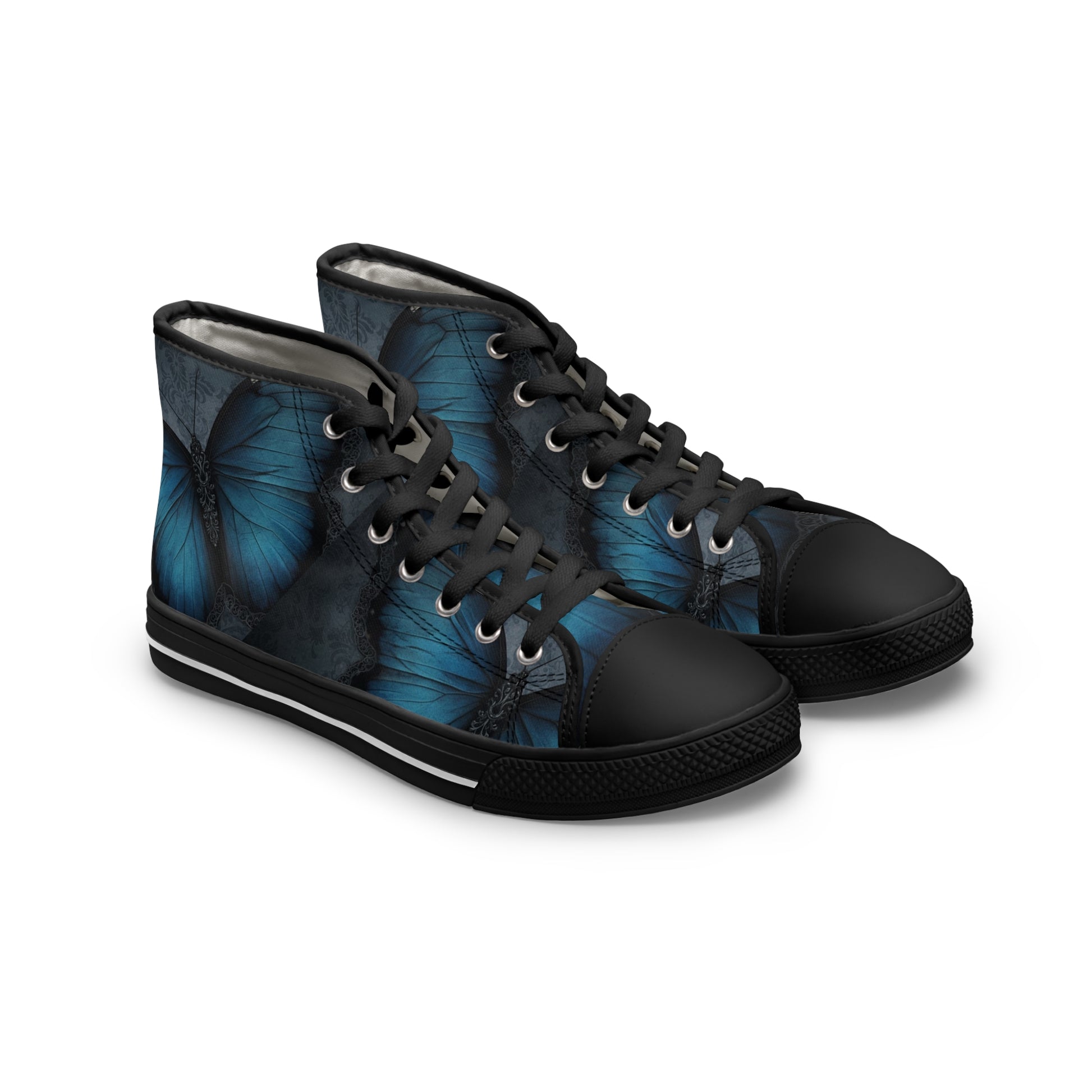 Step into quiet confidence with these high-top sneakers—sleek canvas wrapped in a deep blue butterfly-wing print that reads like a late-night stroll through a moonlit garden. The textured polyester canvas feels soft underfoot while EVA memory-foam insoles cushion every step, so city walks, gallery nights, or long commutes stay comfortable without sacrificing style. Small details—silver metal eyelets, black pleather toe caps, and PU leather accents—give the shoe a durable, crafted feel. The full wraparound print keeps the design bold from every angle, and the sturdy rubber outsole holds up when your day gets long. These sneakers slip into a wardrobe for someone who favors quiet, artful statements and wants footwear that travels as well as they do. Product features - Full wraparound print across both sides and tongue - 100% polyester breathable canvas with PU leather decoration - EVA deodorant memory-foam insoles for shock absorption and comfort - Silver metal eyelets and black pleather round toe for durability - Durable rubber outsole for reliable traction Care instructions - To maintain clean, use warm water with dish soap to clean off any dirt spots. It’s not necessary to soak the whole item. For hard-to-clean spots, use a soft-bristled brush.