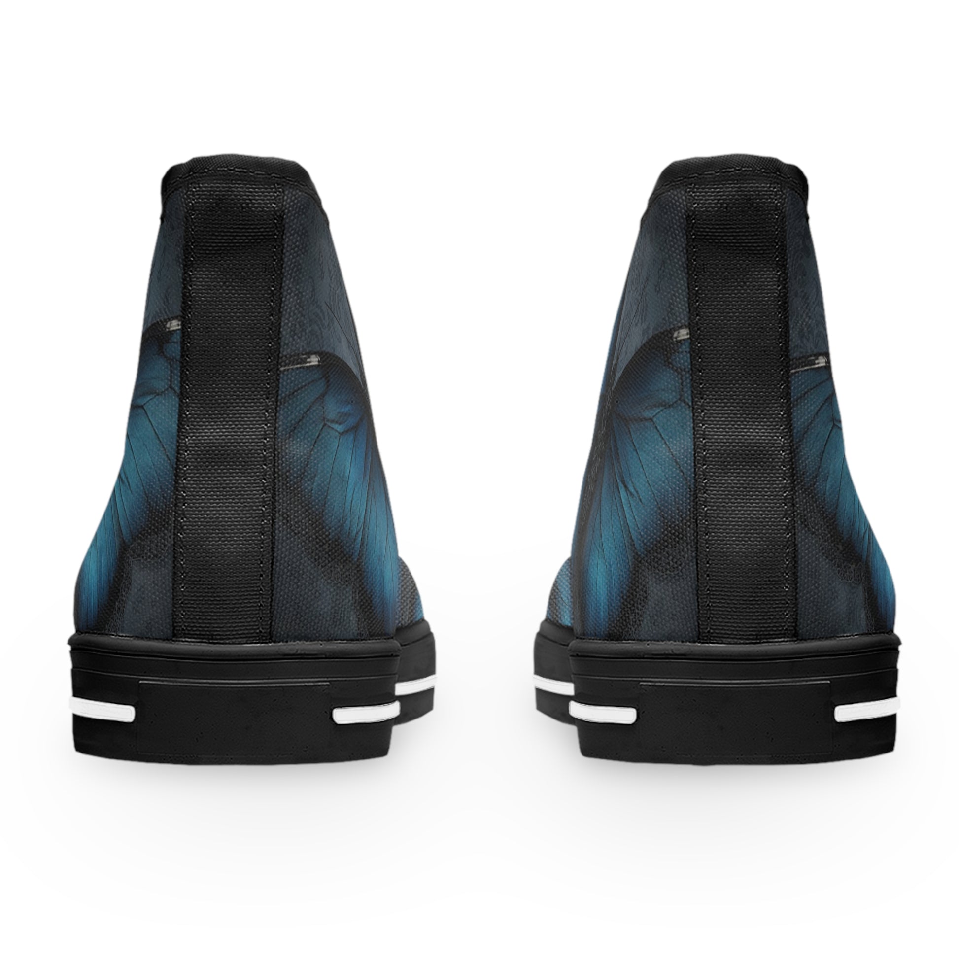 Step into quiet confidence with these high-top sneakers—sleek canvas wrapped in a deep blue butterfly-wing print that reads like a late-night stroll through a moonlit garden. The textured polyester canvas feels soft underfoot while EVA memory-foam insoles cushion every step, so city walks, gallery nights, or long commutes stay comfortable without sacrificing style. Small details—silver metal eyelets, black pleather toe caps, and PU leather accents—give the shoe a durable, crafted feel. The full wraparound print keeps the design bold from every angle, and the sturdy rubber outsole holds up when your day gets long. These sneakers slip into a wardrobe for someone who favors quiet, artful statements and wants footwear that travels as well as they do.