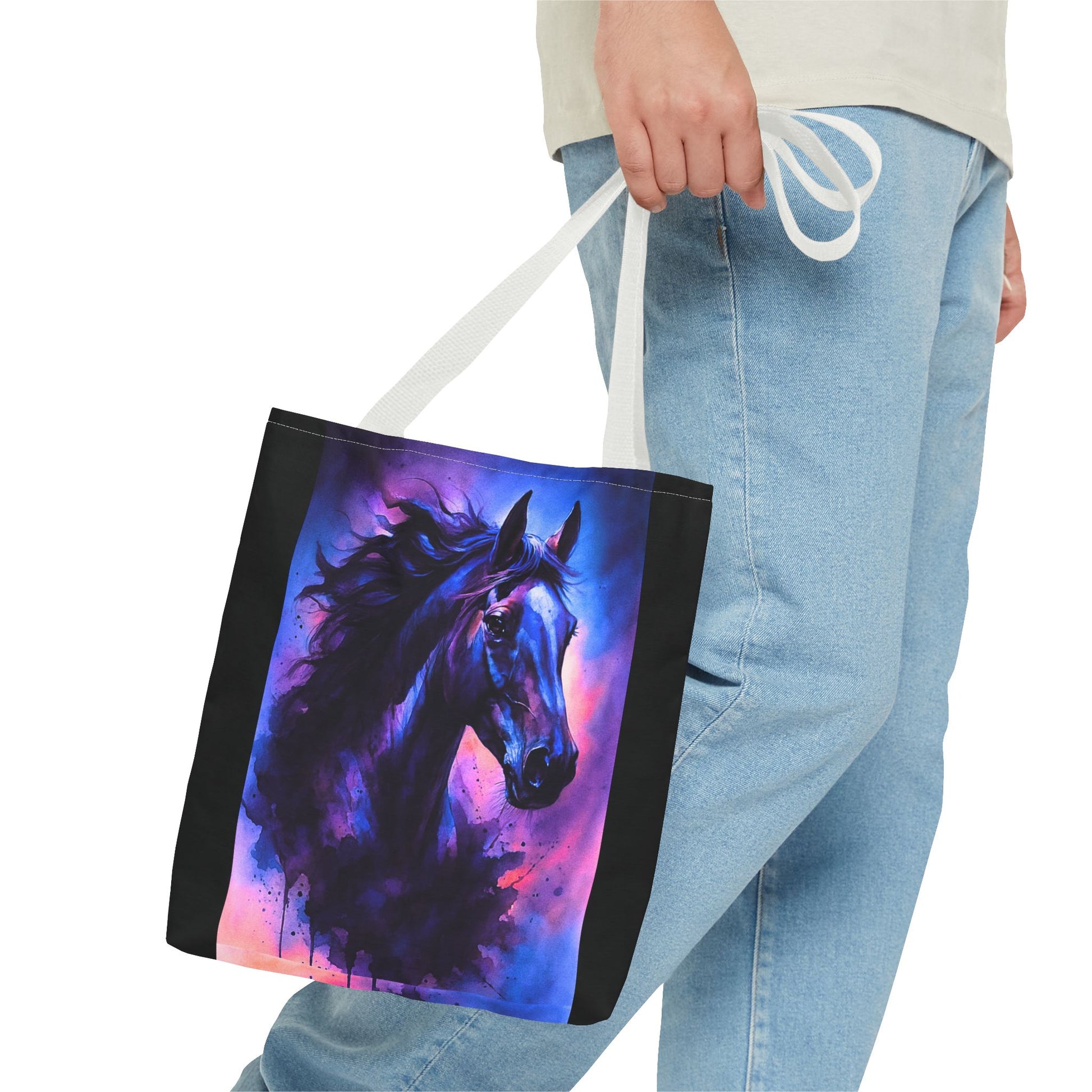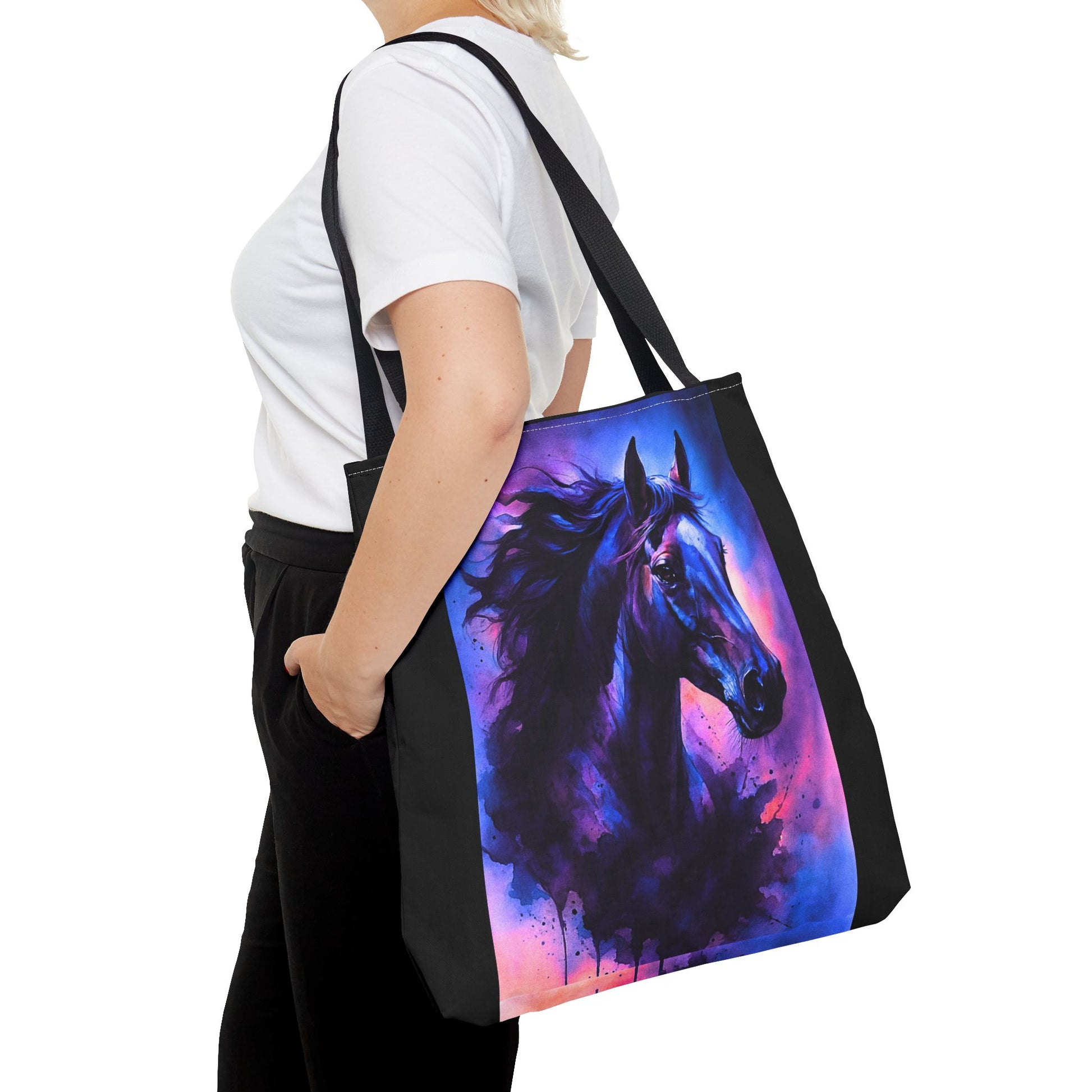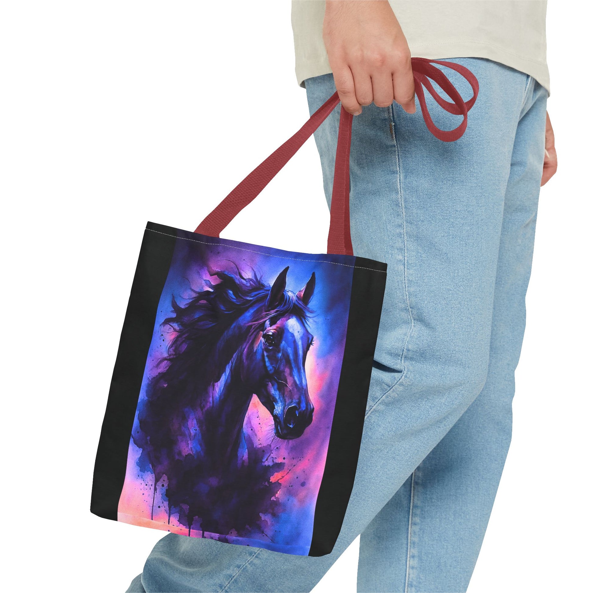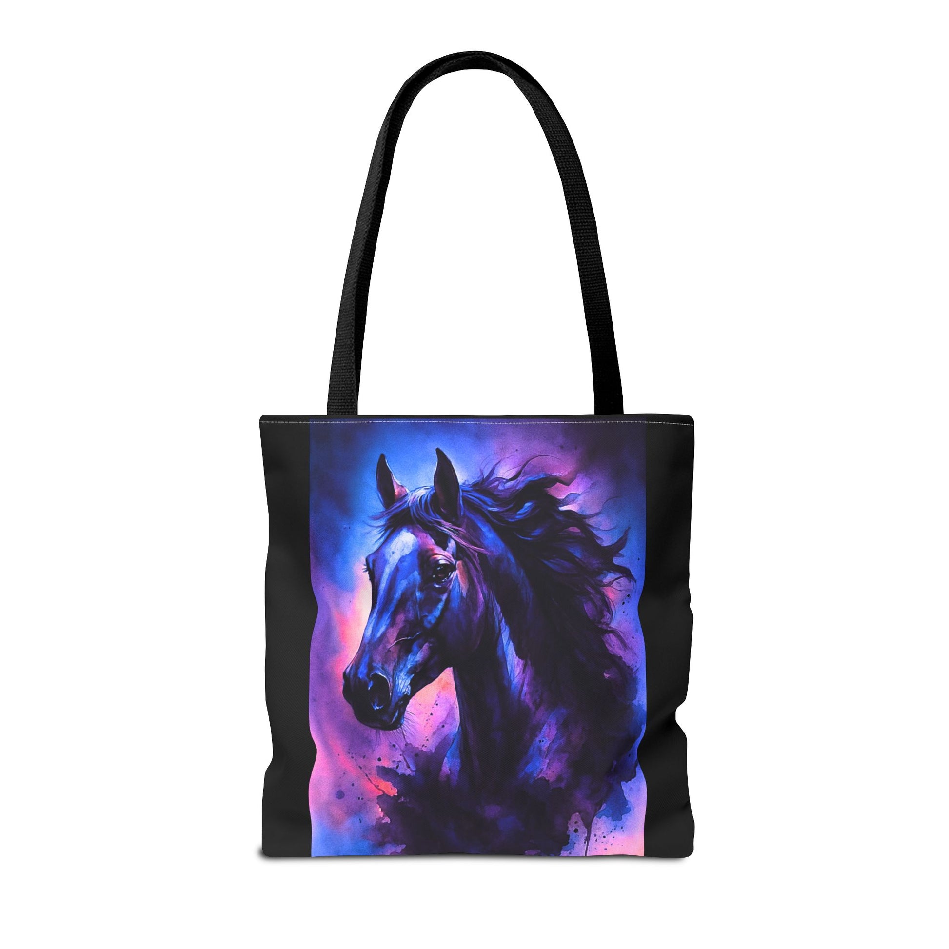 Bold horse tote bag with vibrant blue and purple wild spirit artwork is the perfect accessory for horse lovers. This durable tote bag combines equestrian style with artistic design, making it ideal for daily use, shopping, travel, or gifting. Featuring a unique watercolor-inspired horse print, it captures strength, beauty, and movement. A practical yet stylish choice, this horse art tote bag offers ample space, sturdy handles, and a standout design that will make you feel connected to your passion wherever you go. Perfect for riders, equestrian fans, and those who love unique fashion accessories.