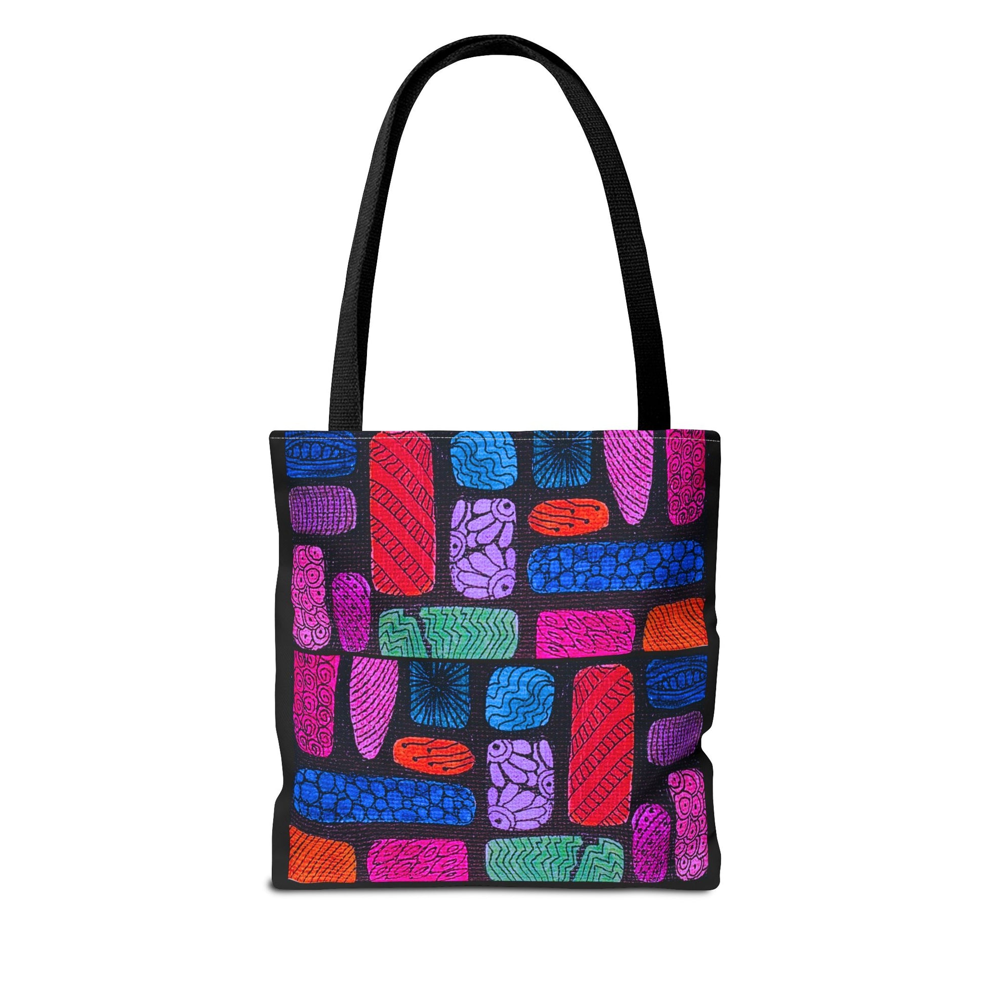 Bright, modern tote that turns everyday errands into a small celebration. The vivid block-pattern print—brilliant pinks, electric blues, greens and reds—feels like a hand-painted collage against a deep background. Lightweight yet sturdy 100% polyester holds its shape and resists dampness, while boxed corners expand the carrying space so groceries, notebooks, or a market haul sit neatly. Reinforced handle stitching and a non-woven laminate interior add durability and structure. Choose from five handle colors and three sizes to match your routine and make your bag feel personal. This tote lives on commutes, market mornings, and quick city escapades — a cheerful companion that wears color with confidence.