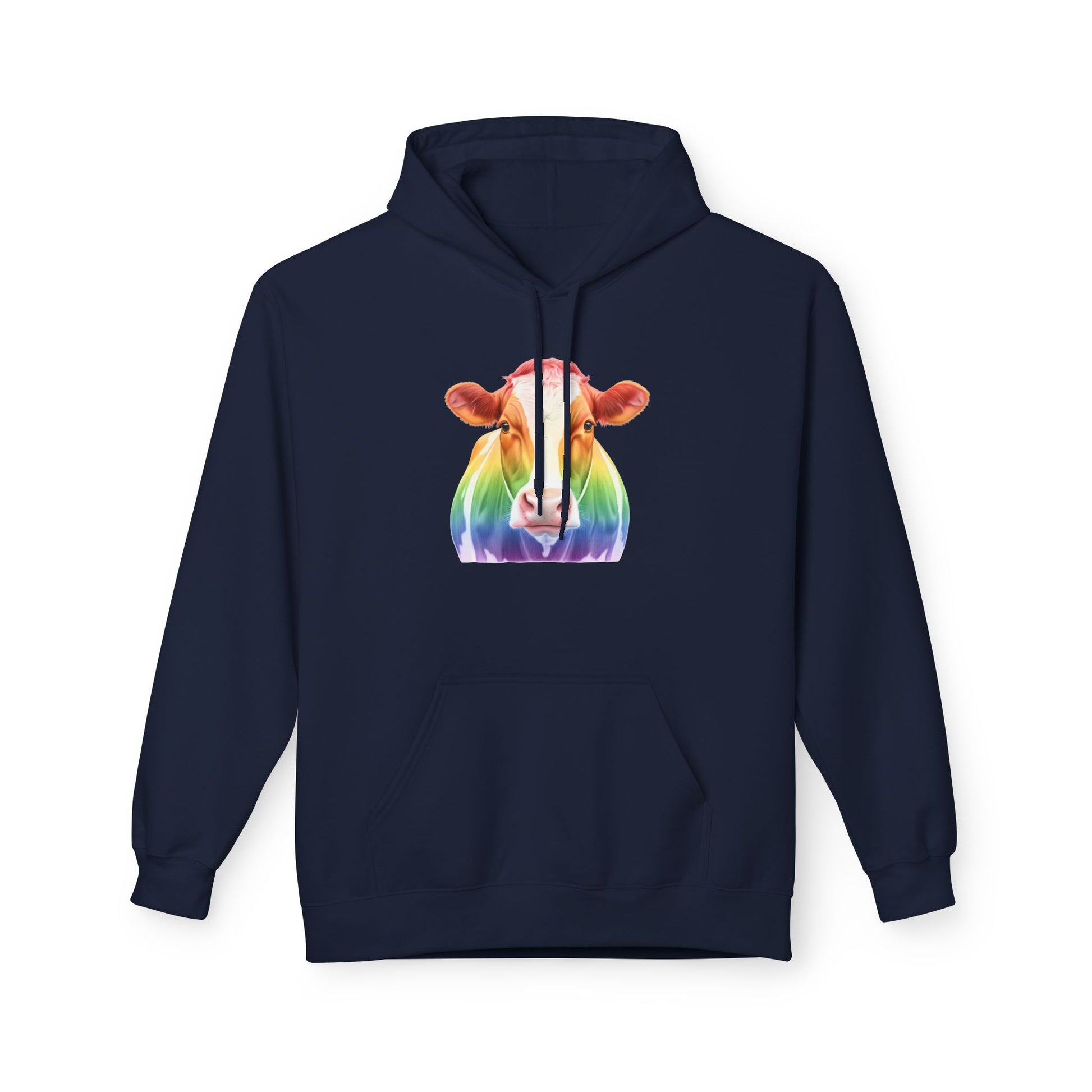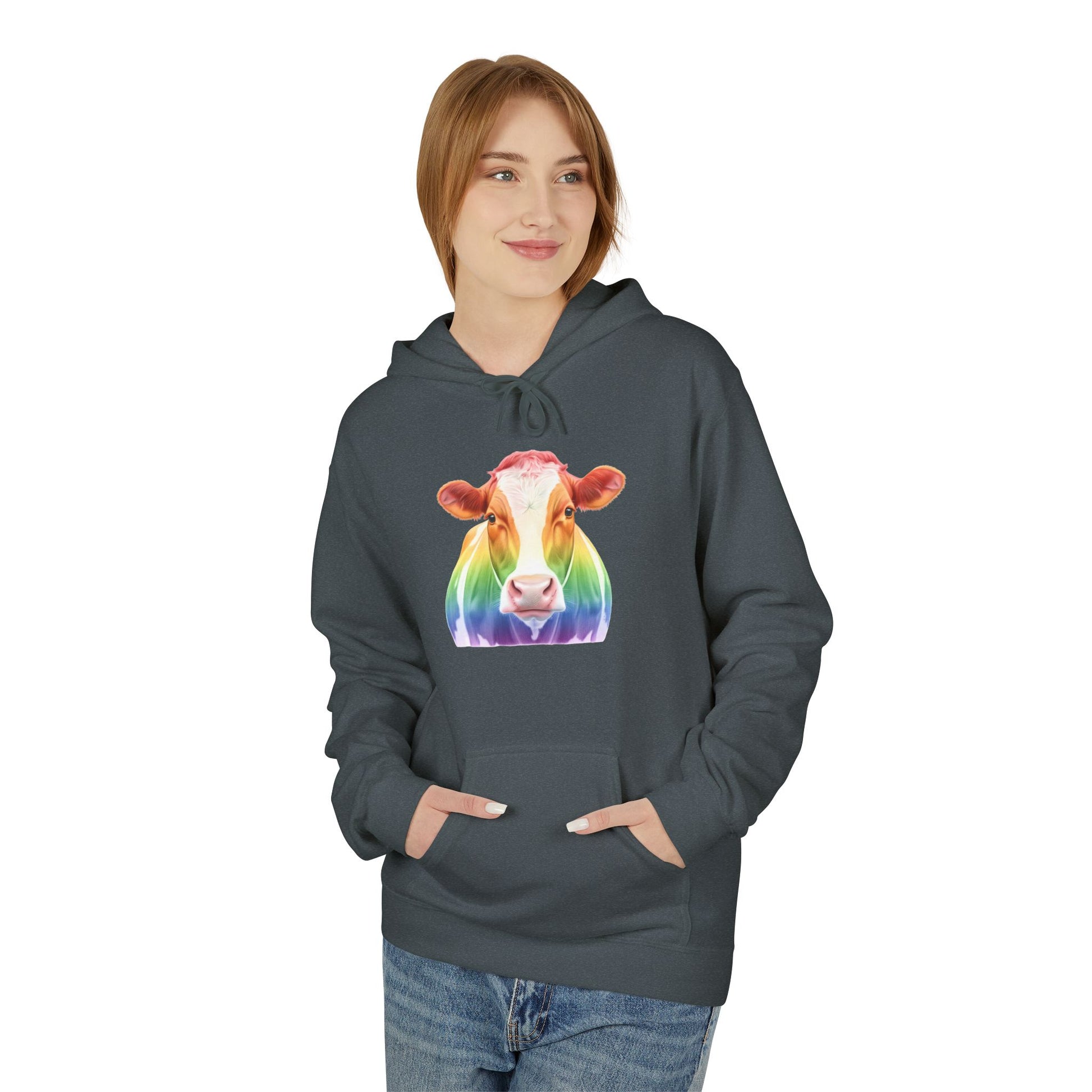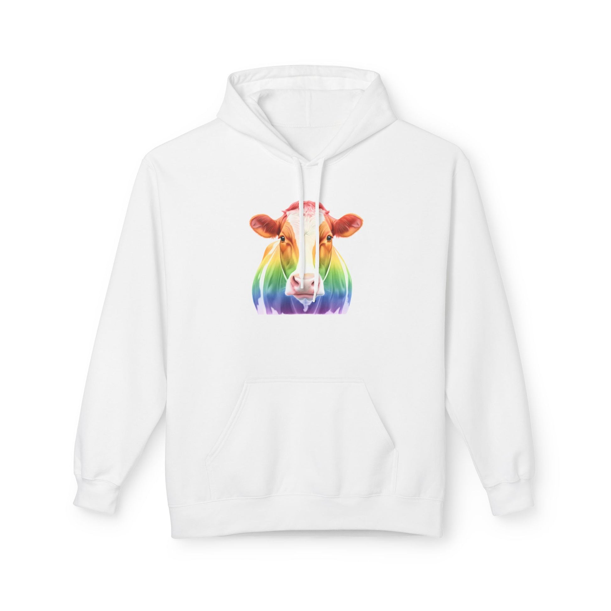 Bright rainbow cow hoodie for farm lovers and colorful apparel fans.