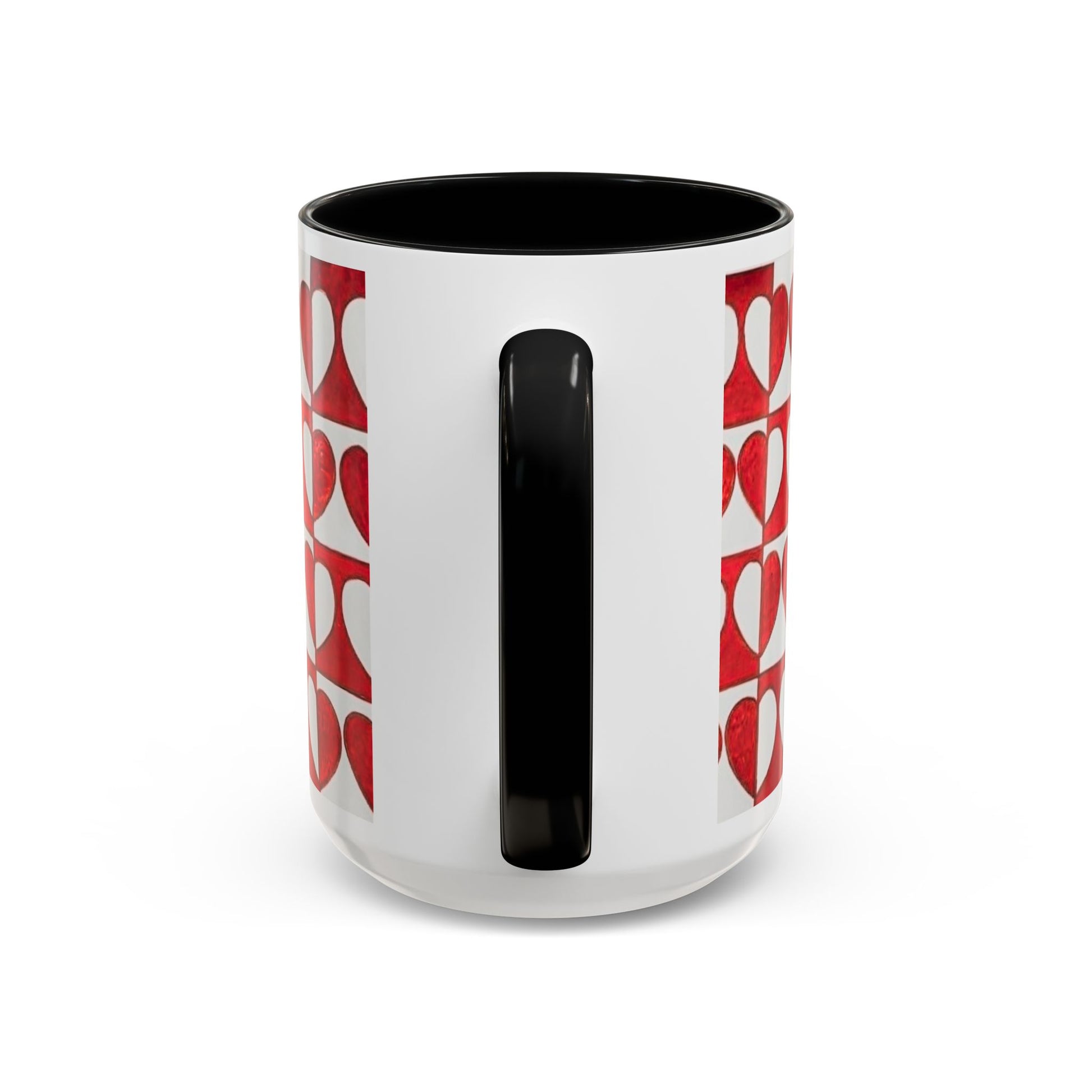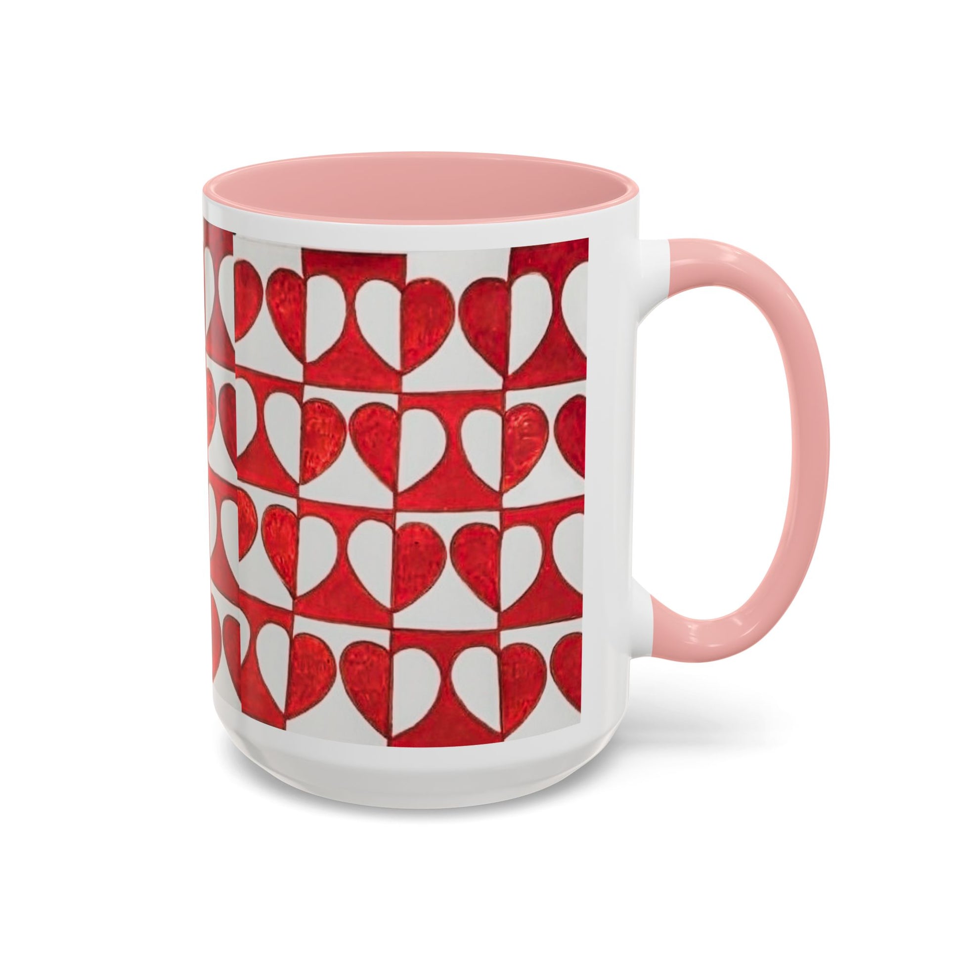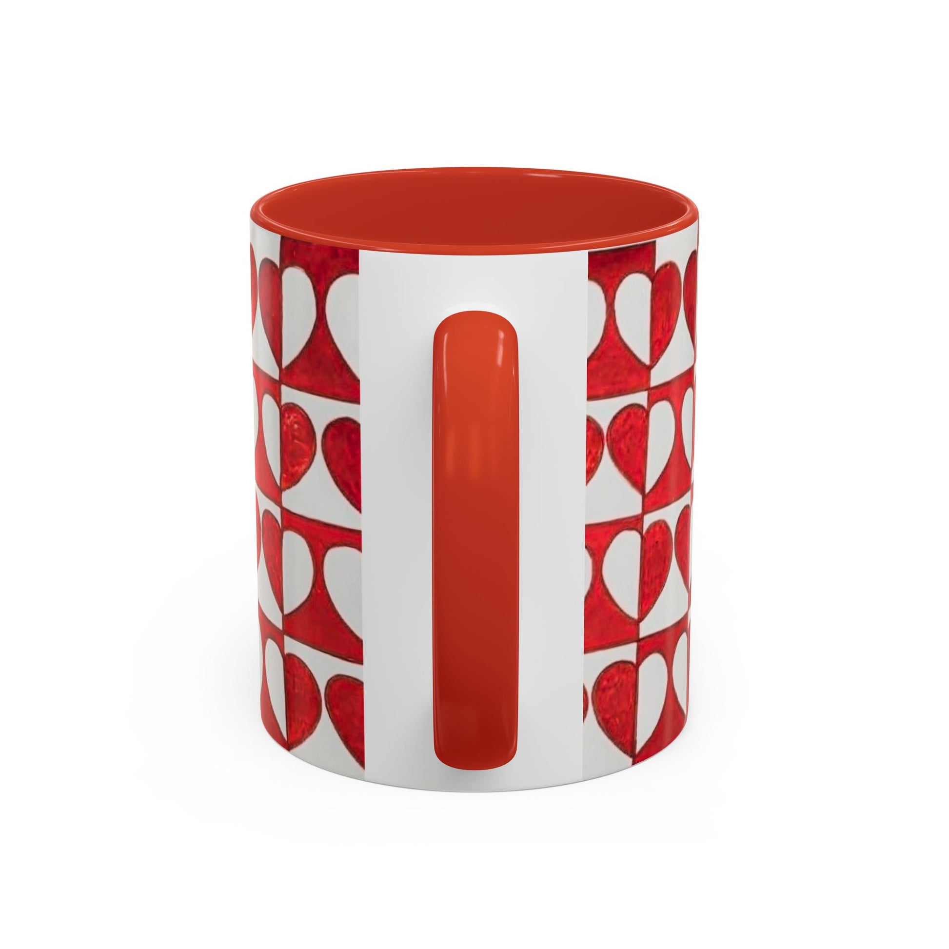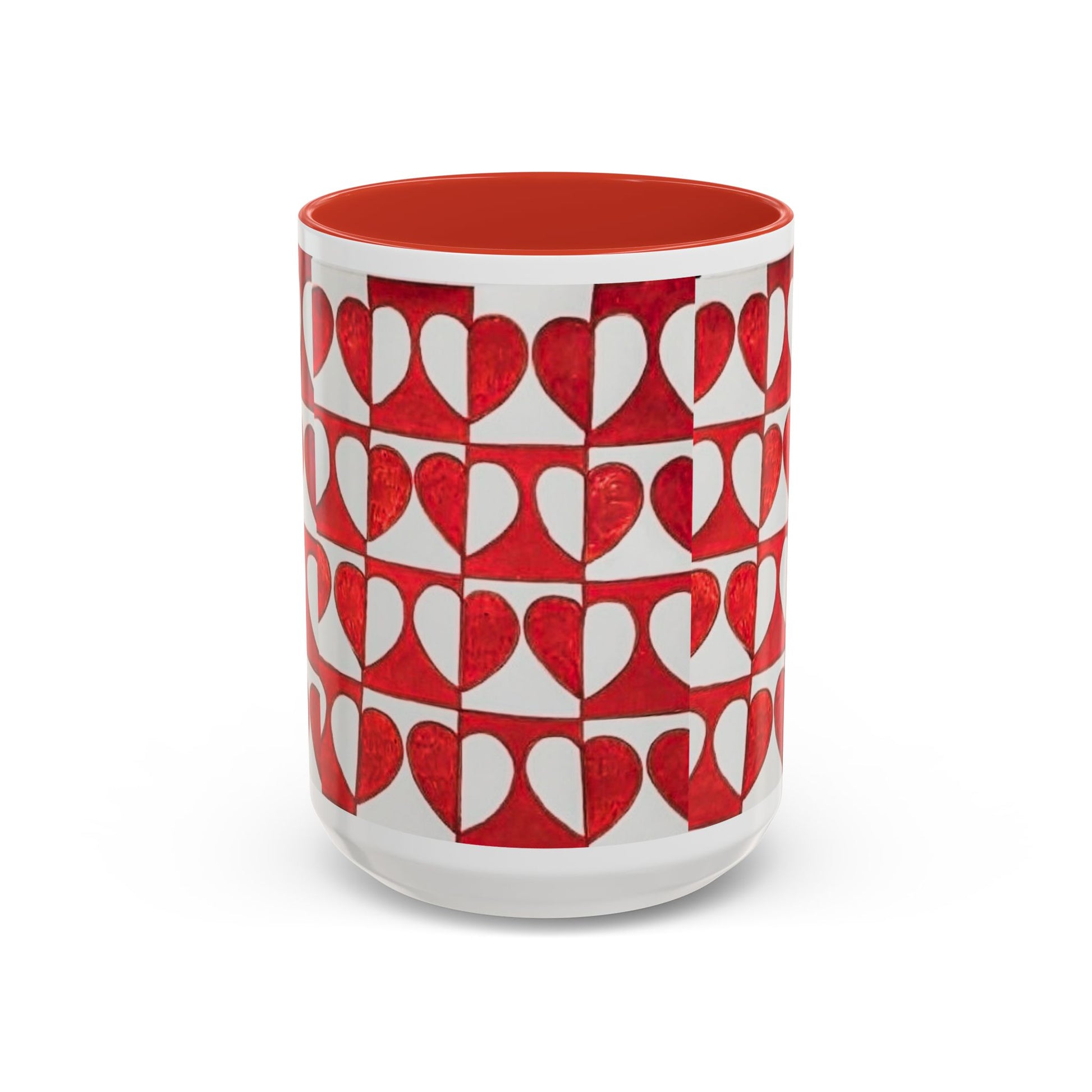 This ceramic accent mug brings a cheerful, handmade energy to everyday coffee or tea. The wraparound pattern of hand-painted red hearts—each set against soft cream blocks—creates a warm, slightly vintage look that brightens a morning routine or a slow afternoon. The colored interior and handle add a pop of contrast that frames the artwork, while the glossy finish makes the reds sing and gives the surface a lively sheen. Hold it in your C-shaped grip and feel the familiar weight of a well-loved cup; the durable print and dishwasher- and microwave-safe ceramic mean it’s ready for daily use and small celebrations alike.
