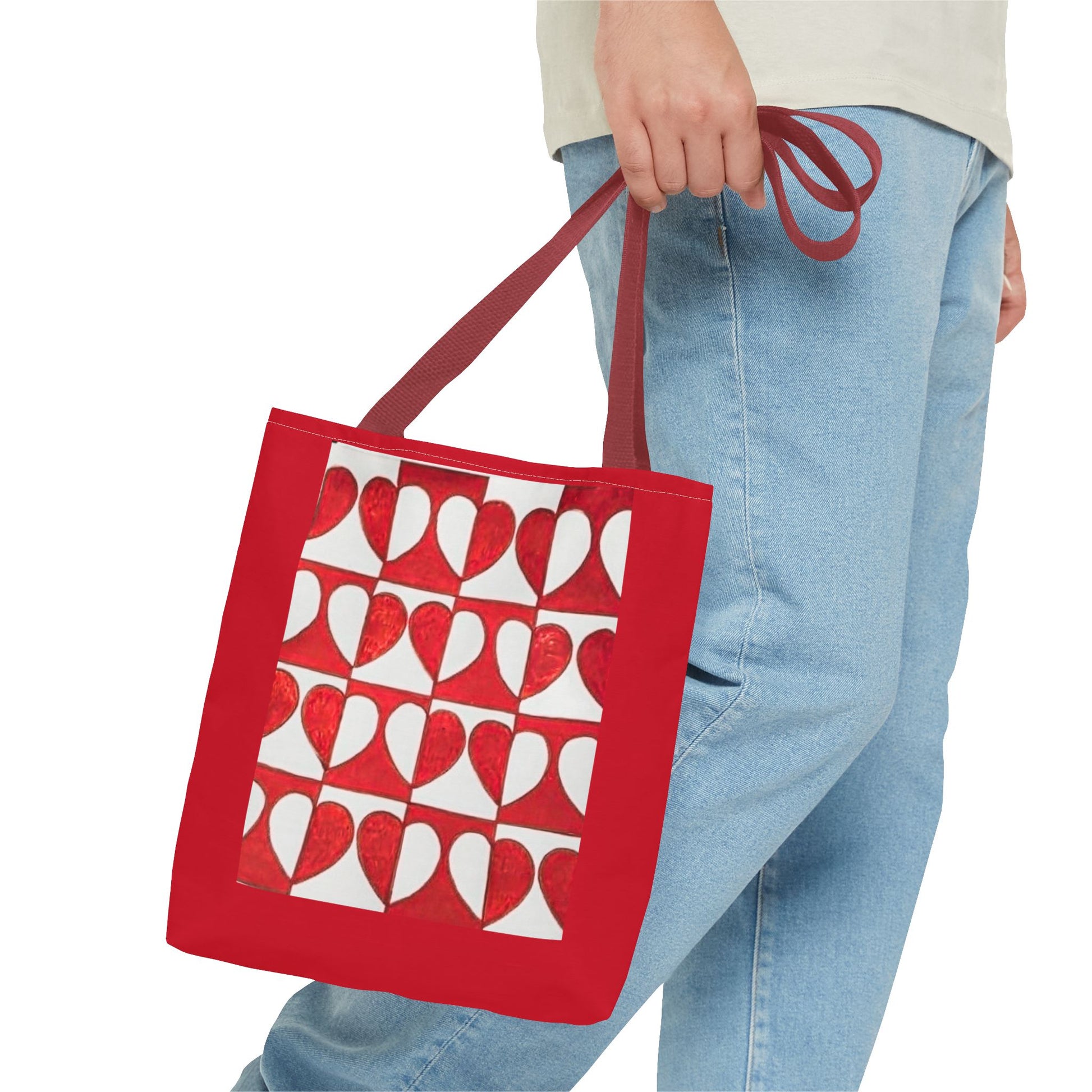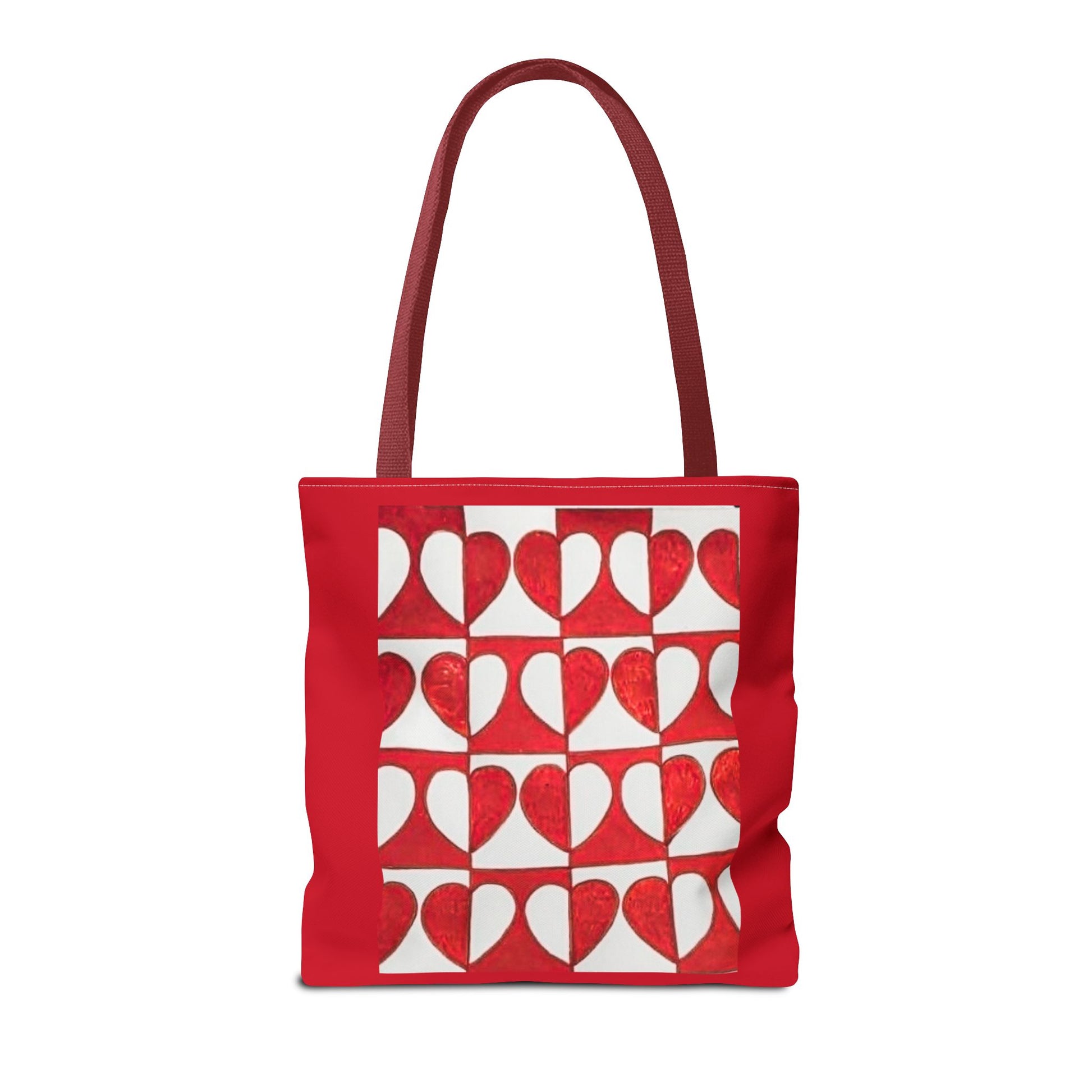 This roomy tote brings warm, handmade charm to your everyday carry. The repeating red-heart pattern feels like a patchwork of small paper-cut valentines — bright, slightly rustic, and joyful. Carry it over a shoulder for farmers market runs, library days, or neighborhood strolls. The medium-weight polyester holds its shape while the boxed corners give extra room for groceries, sketchbooks, or a laptop. Choose a handle color that matches your mood and let this bag add a cheerful, artful note to routines and slow, intentional moments.