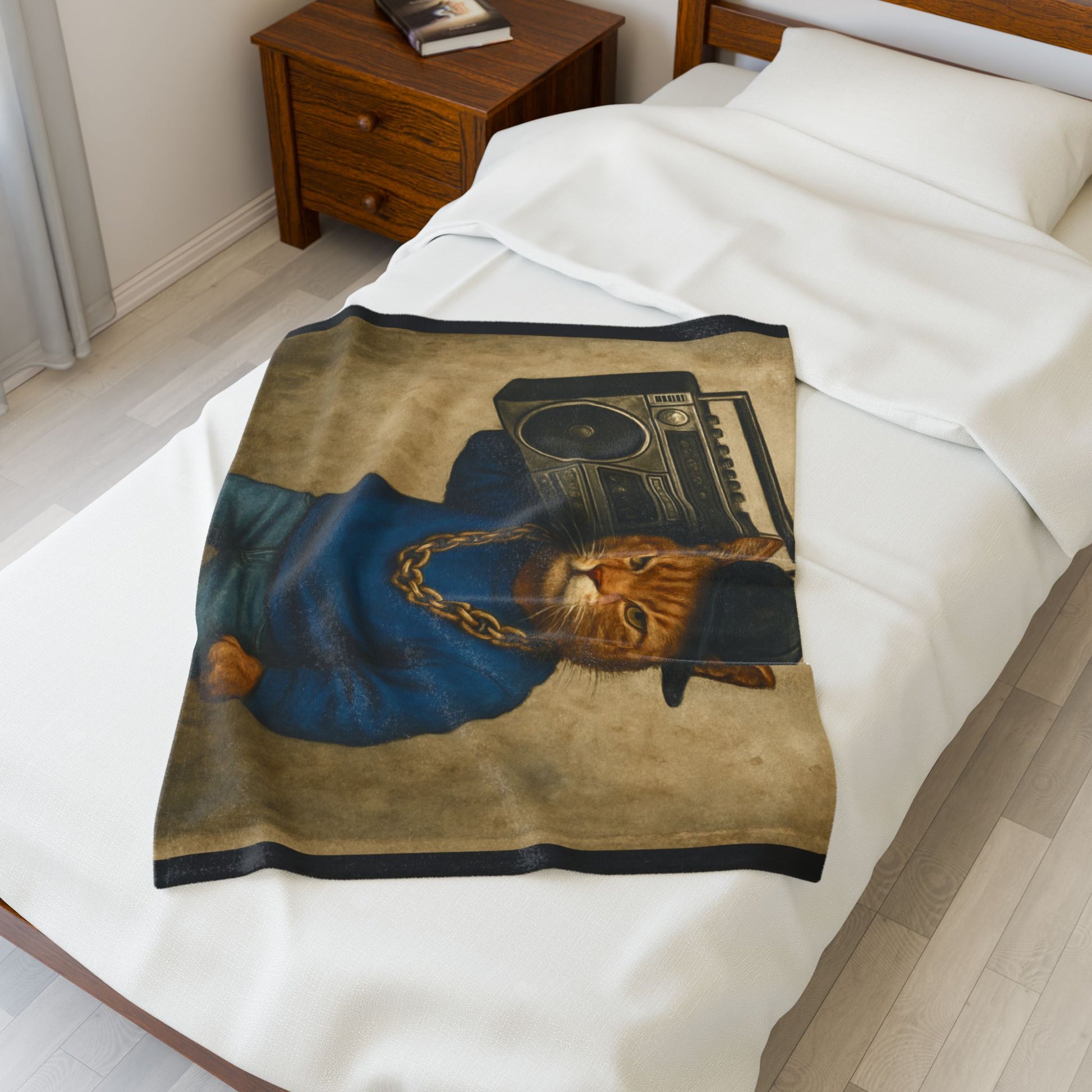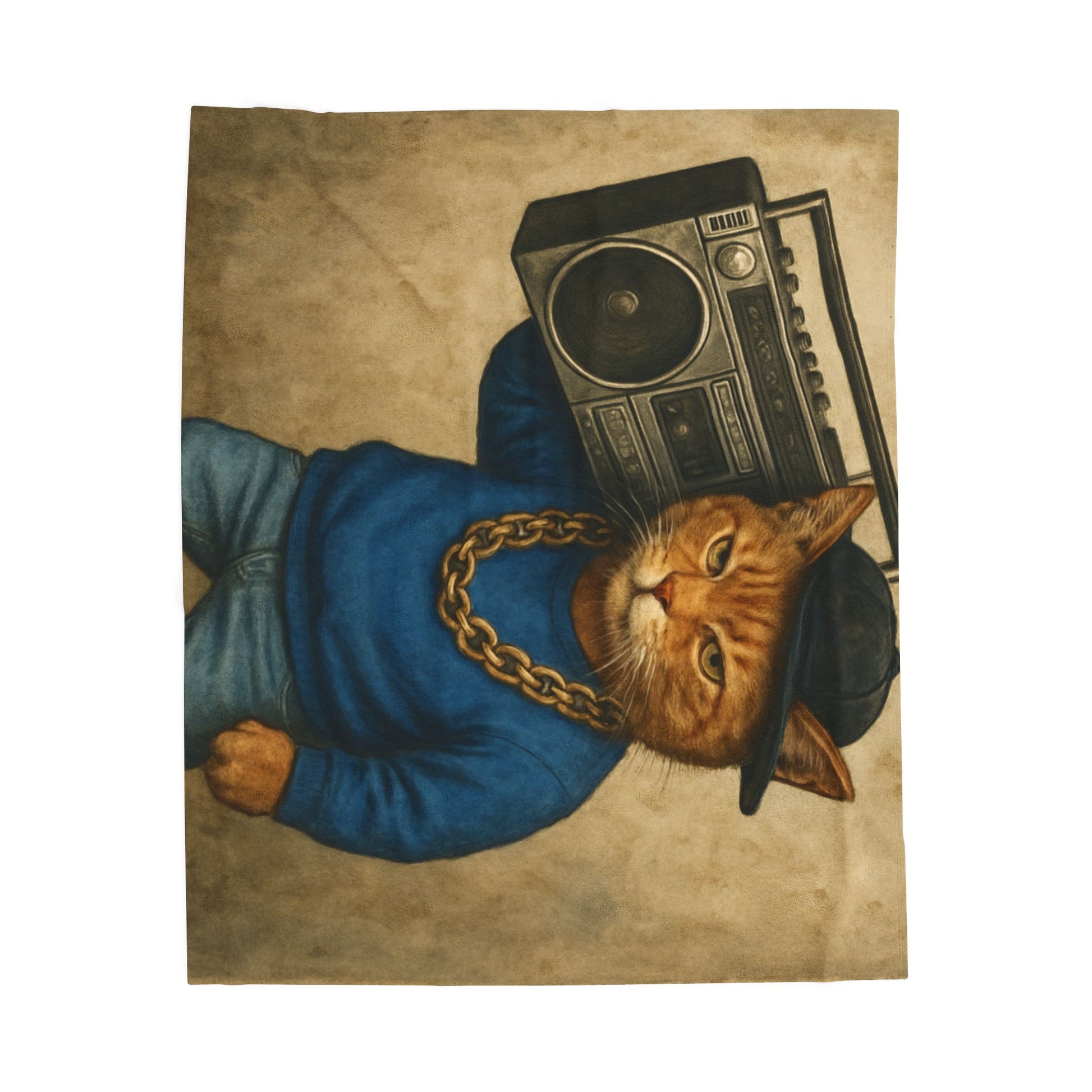 Retro Boombox Cat Velveteen Plush Blanket | Vintage Hip-Hop Kitty Throw