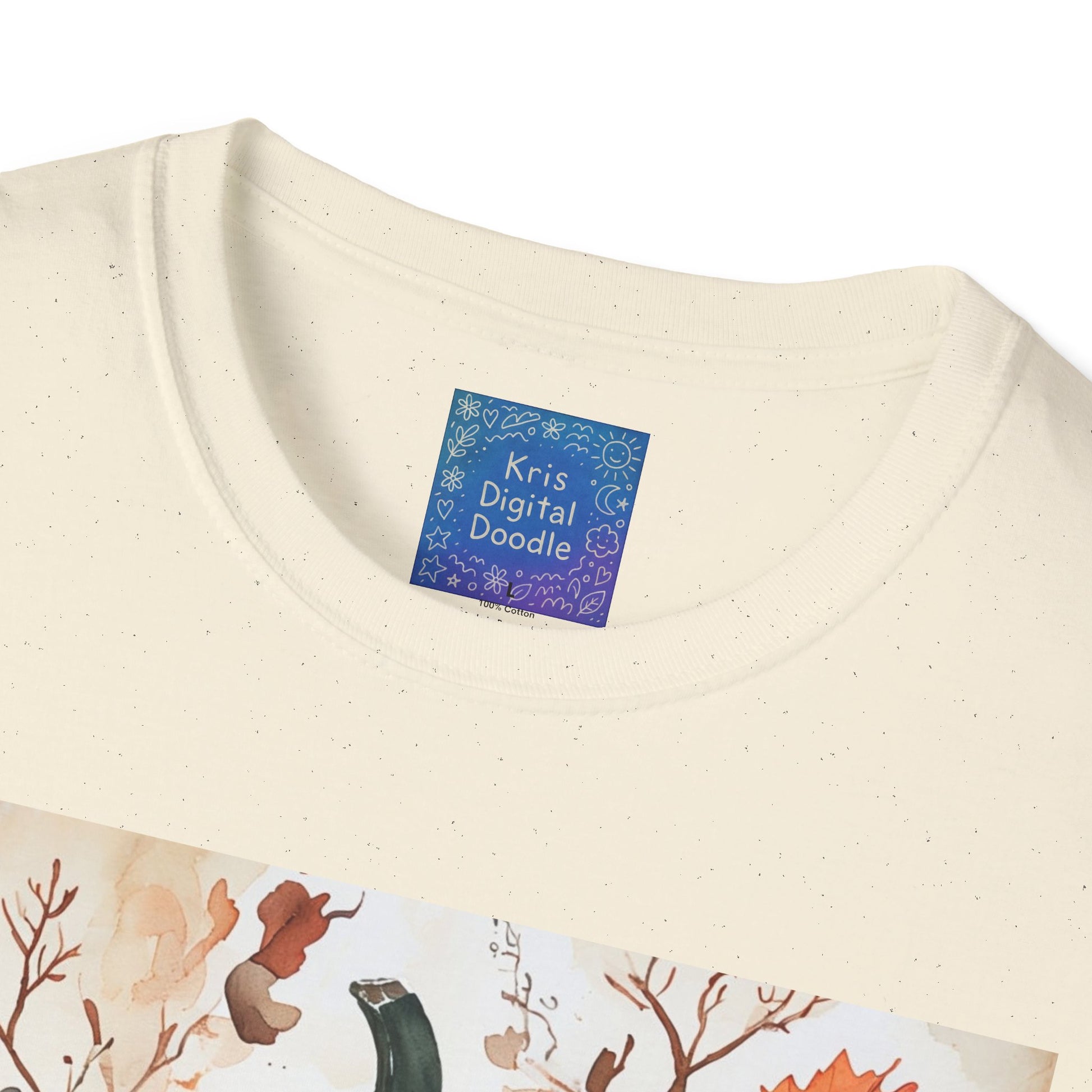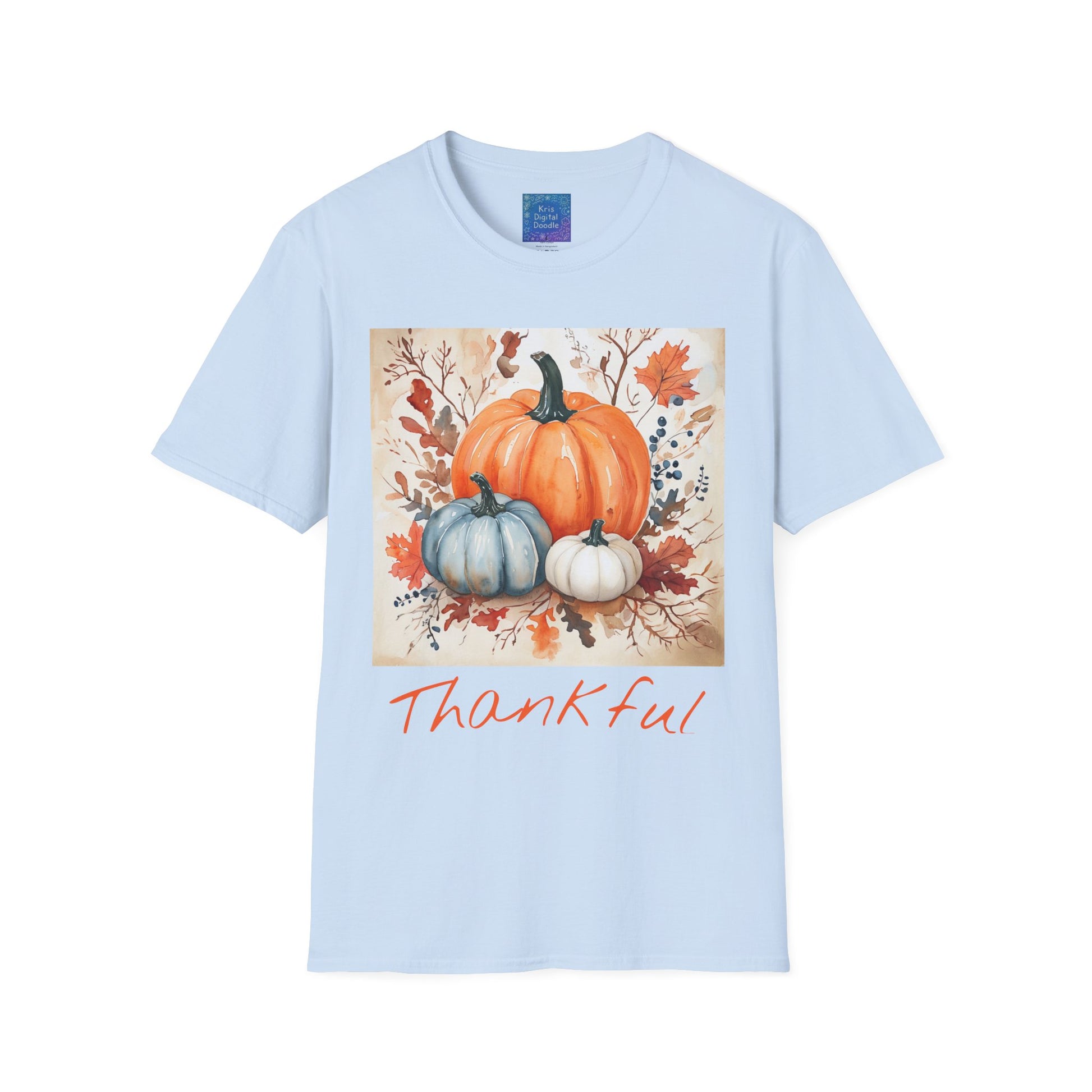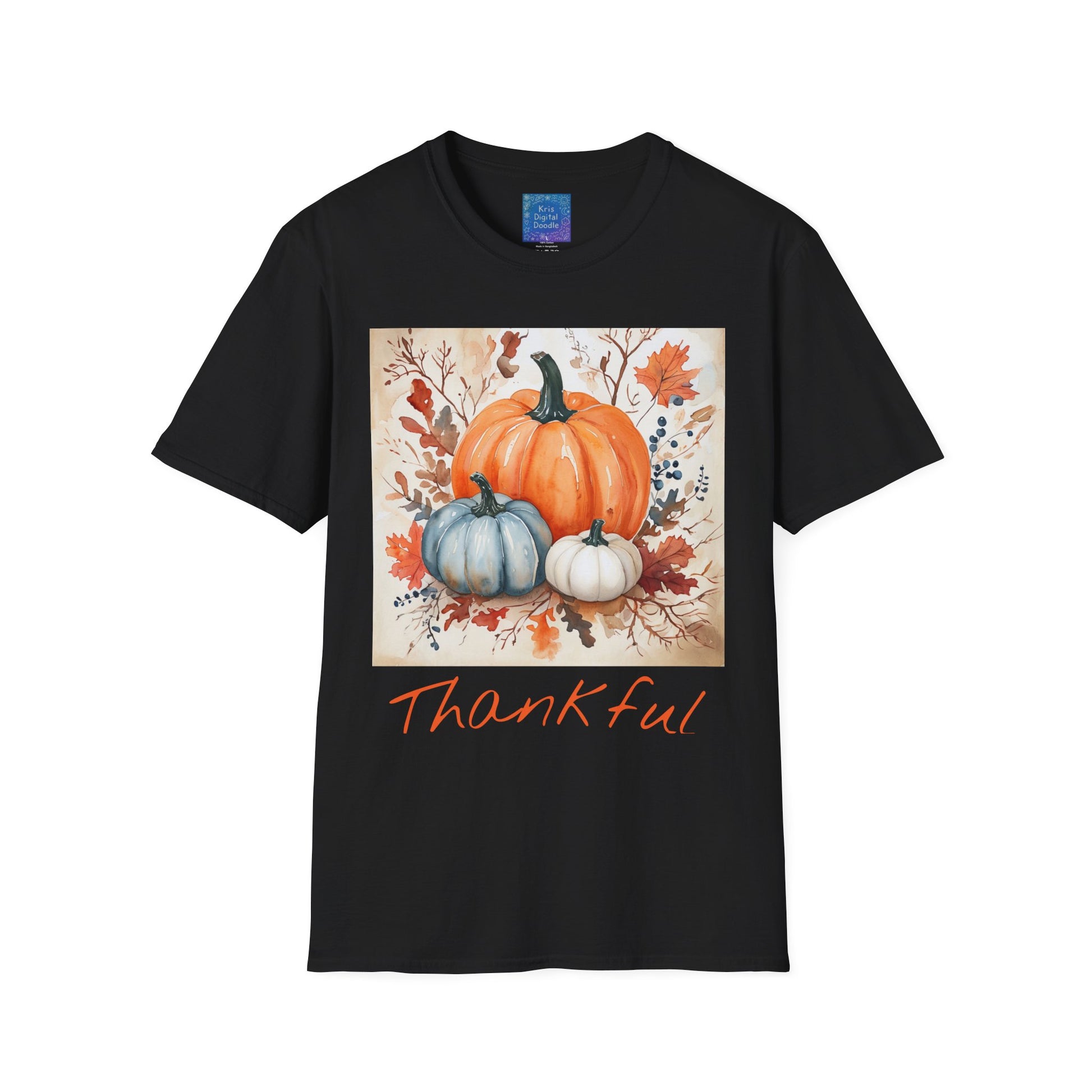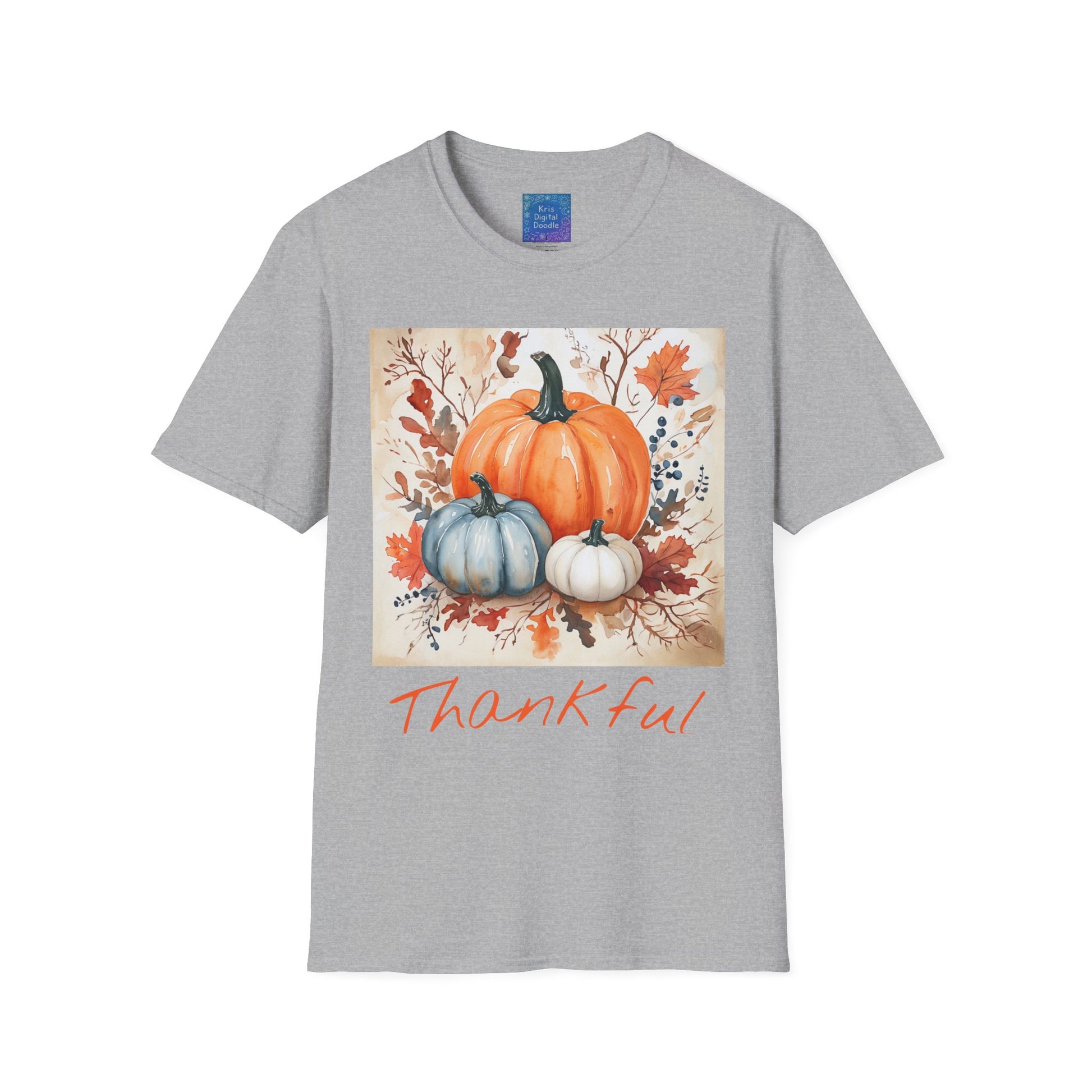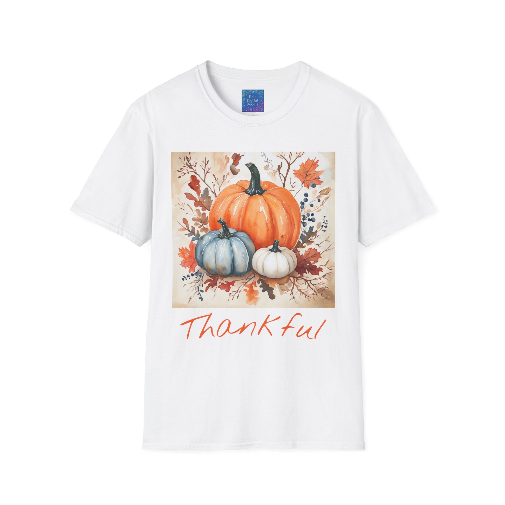 Thankful pumpkin t-shirt fall harvest shirt with autumn graphic design. This unisex softstyle tee features watercolor pumpkins with rustic fall leaves, making it the perfect Thanksgiving outfit, casual fall fashion staple, or thoughtful autumn gift. Comfortable cotton blend fabric ensures style and durability for seasonal wear. Ideal for cozy gatherings, fall festivals, or everyday autumn vibes.