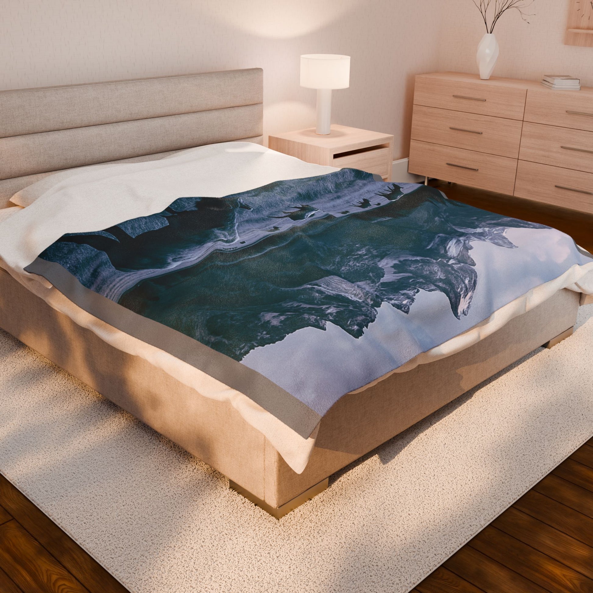 A velvety plush blanket printed with a moody mountain-and-wildlife scene that feels like stepping into a quiet, early-morning alpine meadow. The surface is luxuriously soft, with rich, high-detail color on one side and a smooth white reverse. It drapes easily over shoulders or across a couch, offering a gentle, warm weight that invites lingering — a still moment by a lakeshore as elk move through mist beneath towering peaks. This blanket fits naturally into the routines of people who chase outdoor calm: wrapped around late-night reads, draped over a camper bench, or layered for slow weekend mornings and house gatherings that linger long into dusk.