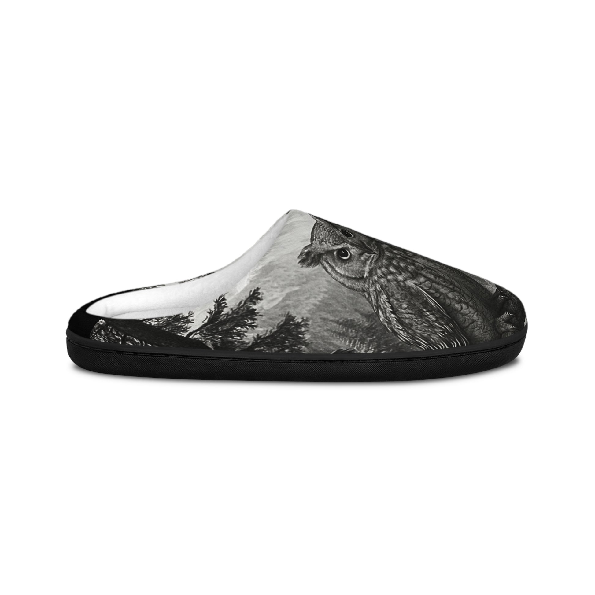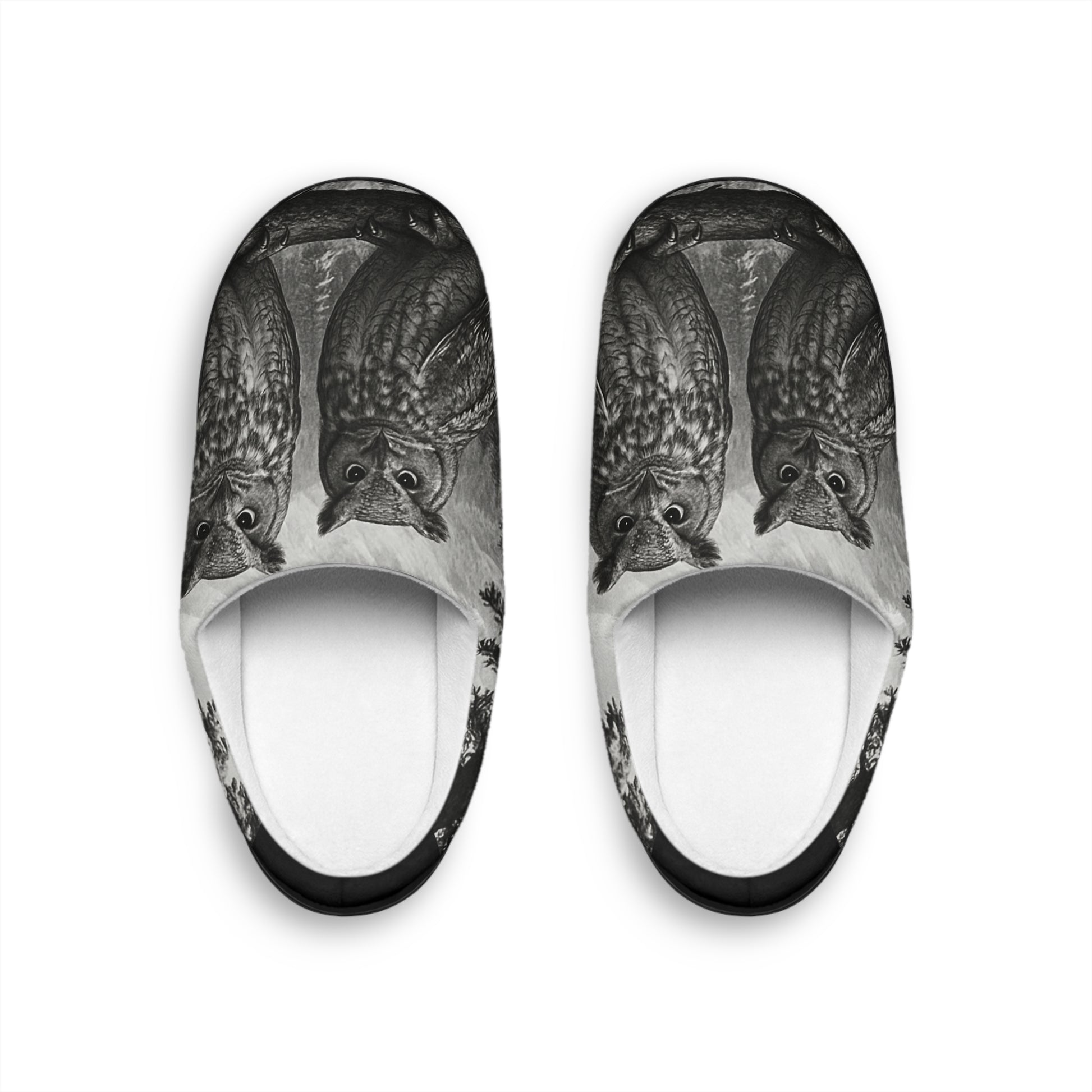Owl slippers featuring cozy wildlife art for nature lovers.