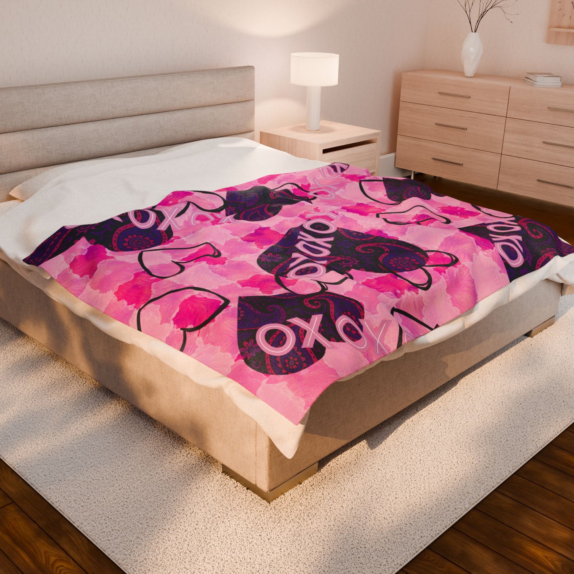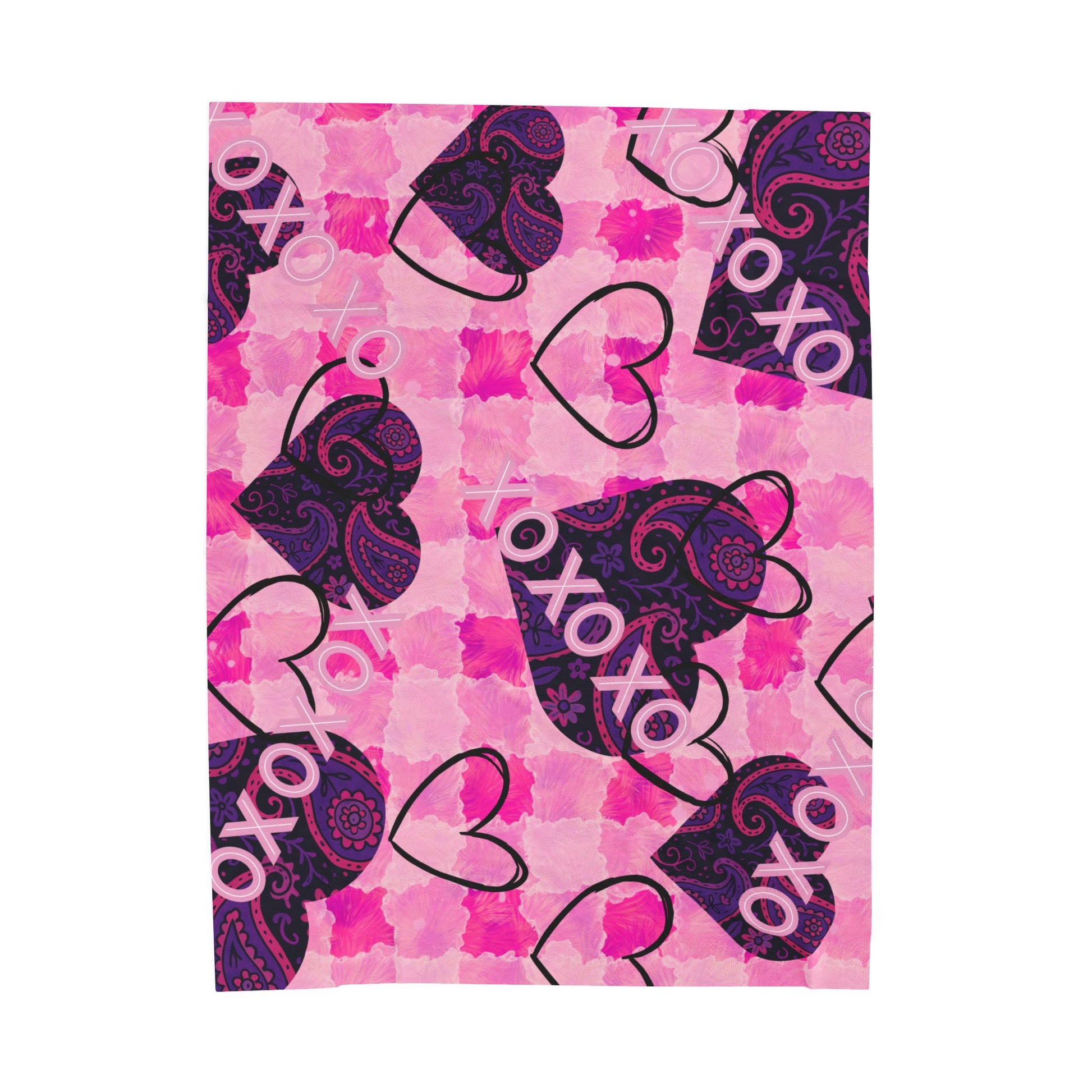 XOXO Heart Pattern Velveteen Plush Blanket | Pink Paisley Hearts Throw